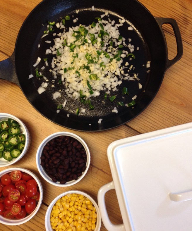 This casserole is easy, quick and full of flavor! I have boat loads of cherry tomatoes coming out of the garden right now as well as jalapeños so it is a good way to use up some of those as well! I had beautiful tasty cilantro in the garden early this summer, until a pesky gopher ate the majority of it! So that explains the pitiful looking cilantro well the hot 90 degree NC weather hasn’t helped either.