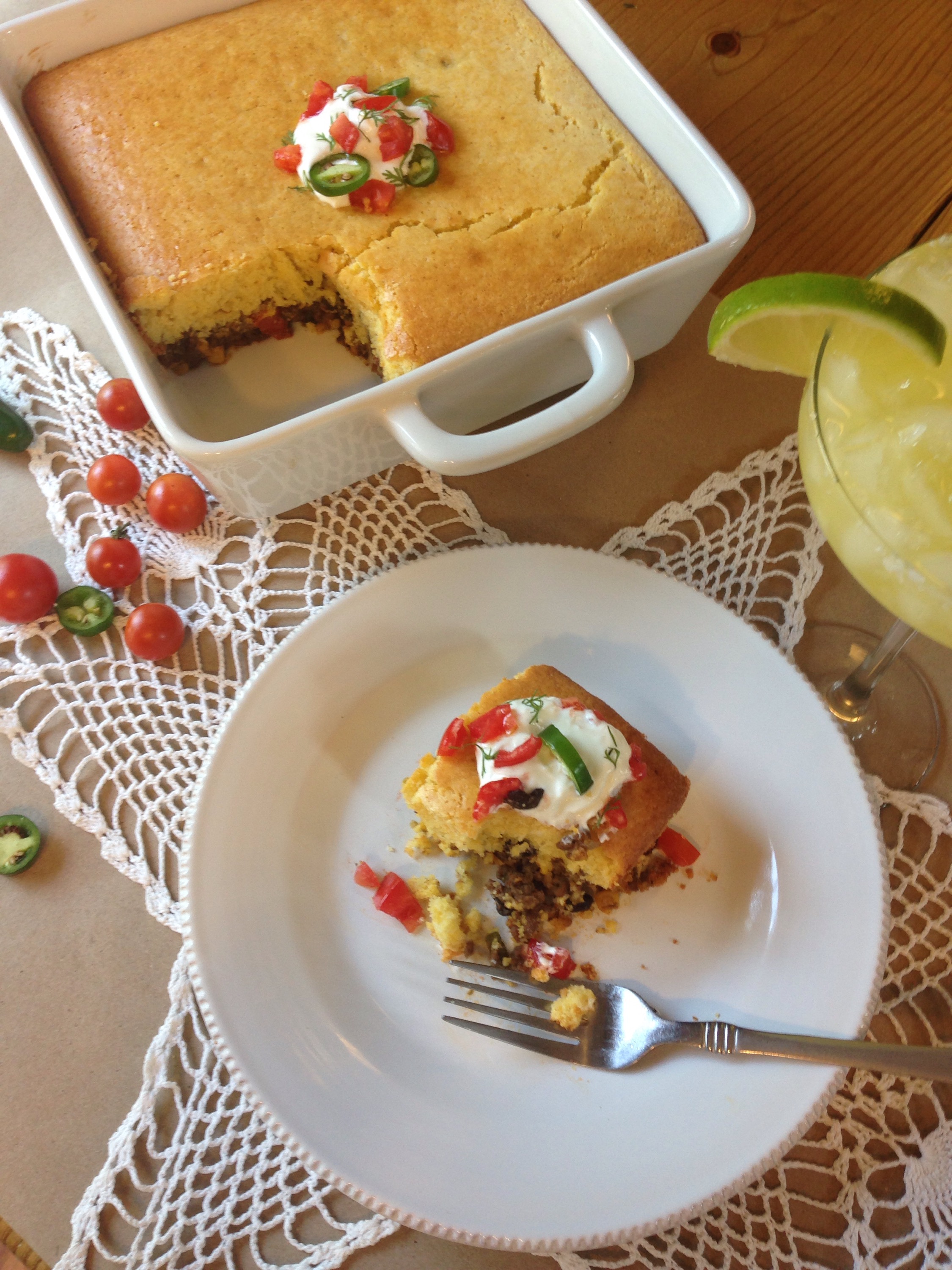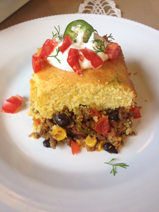 Take the corn bread mixture and pour over the meat mixture. You don’t want to see any of the meat mixture when your layering the cornbread mixture on top. Place in the oven and cook for 30-35 minutes or until the edges of the corn bread have browned. Let set for 10 mins before serving.