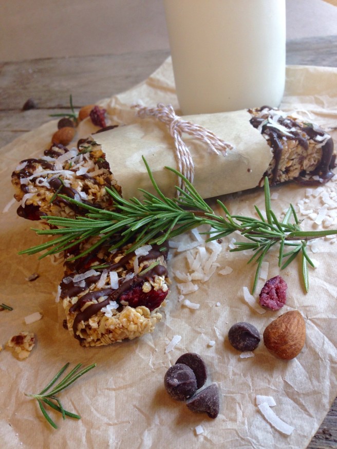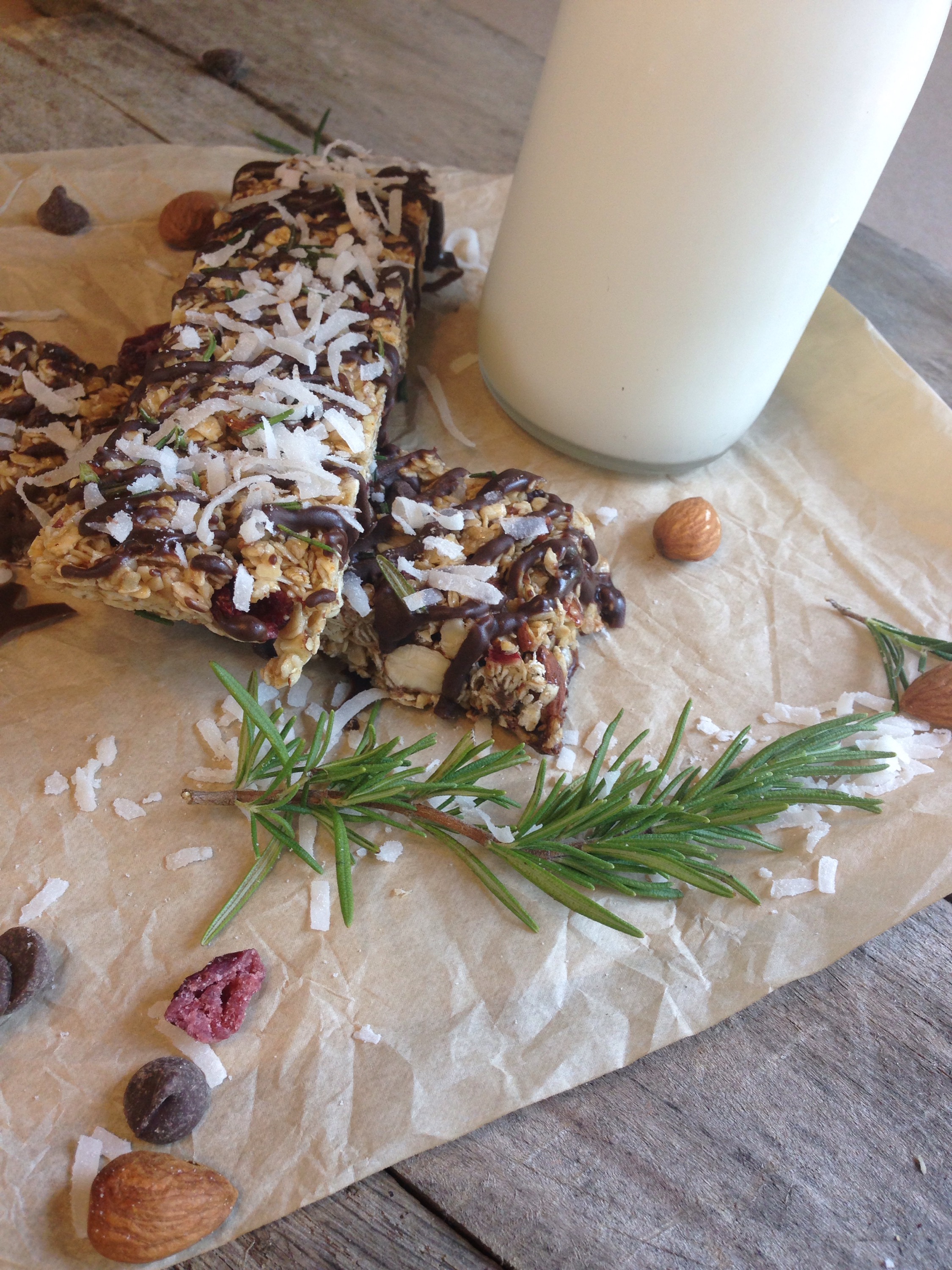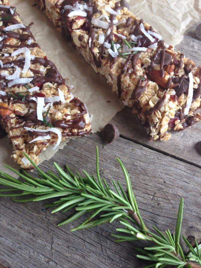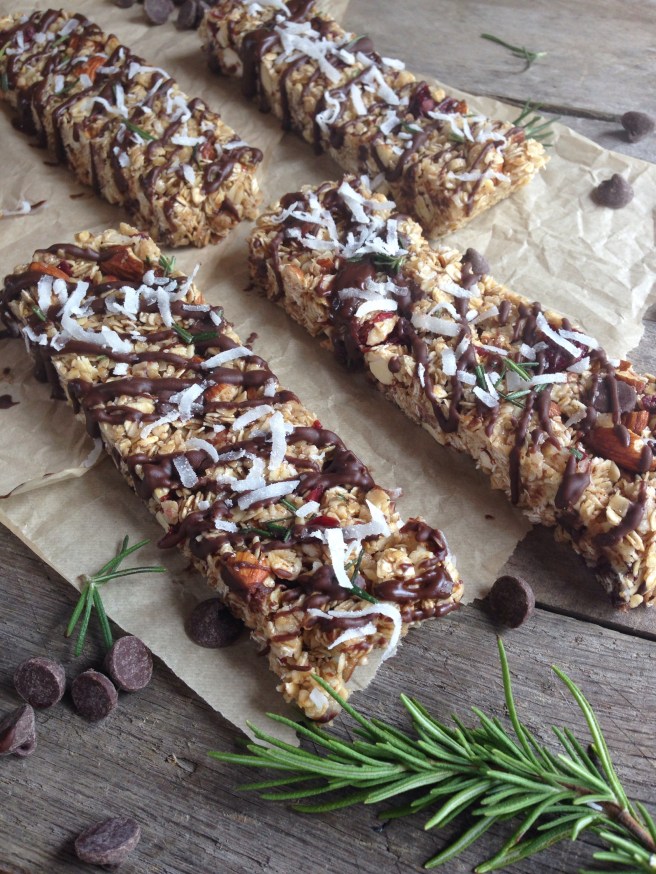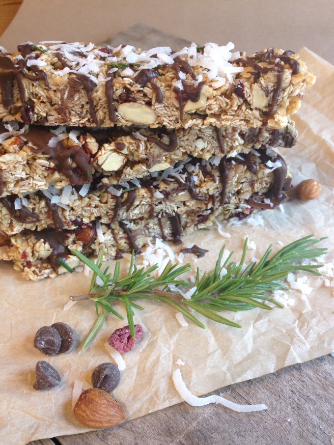 With a spoon drizzle chocolate over bars and sprinkle with coconut and chopped rosemary. Allow chocolate to set for 30 mins. Indiviudally wrap with plastic wrap and enjoy when desired!