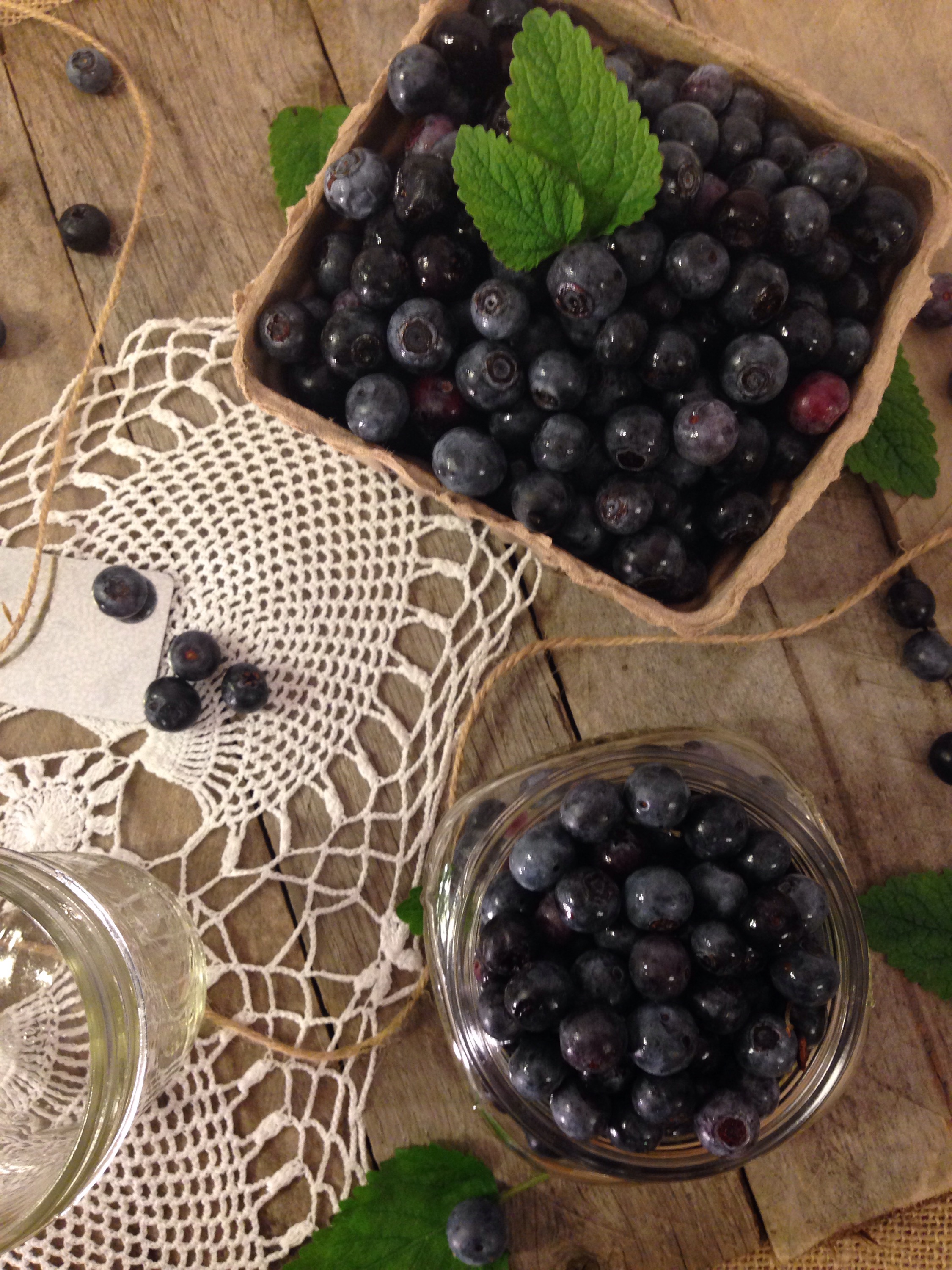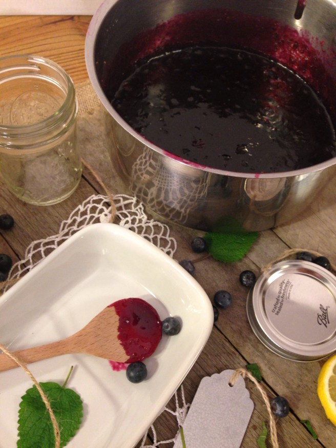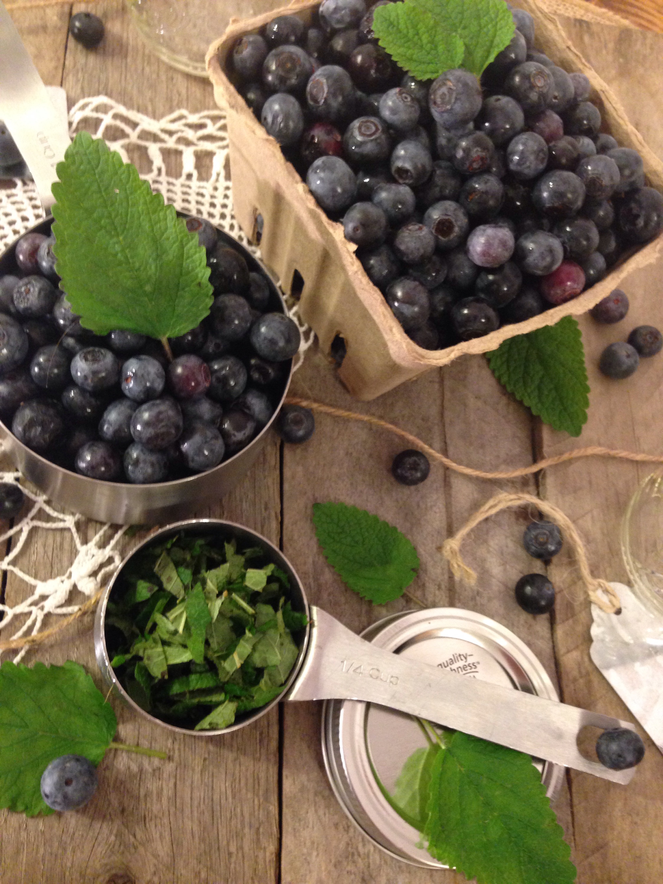 I had about 3 lbs of blueberries to make do with after we went pickin’. My blueberry muffins were at the top of the list but making jam was second! I wanted to make blueberry and basil jam but my basil plants were looking rough due to the heat. My lemon balm on the other hand was exploding out of its square foot so I thought lemon balm and blueberry jam! Why not?