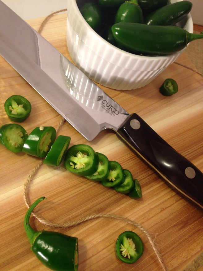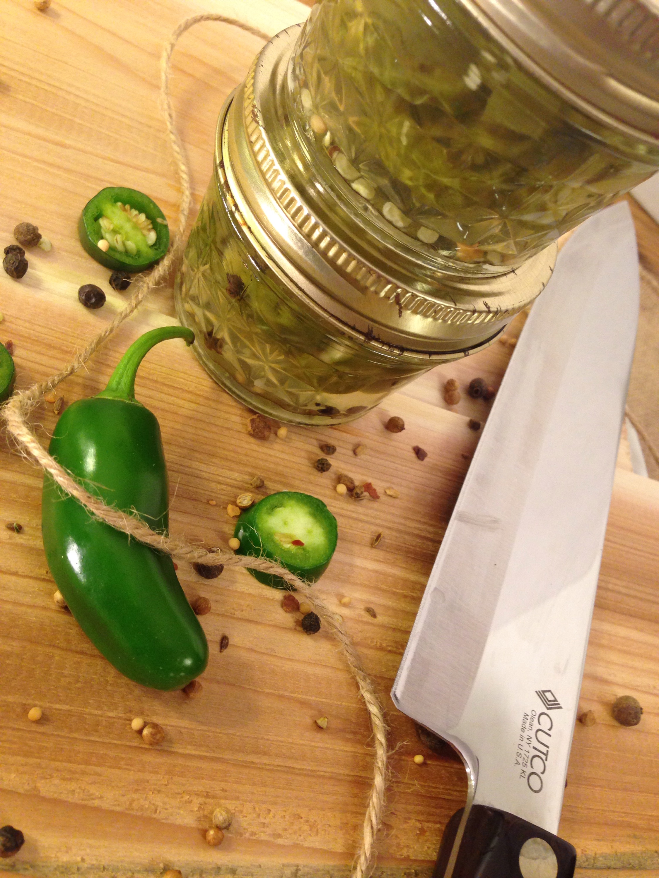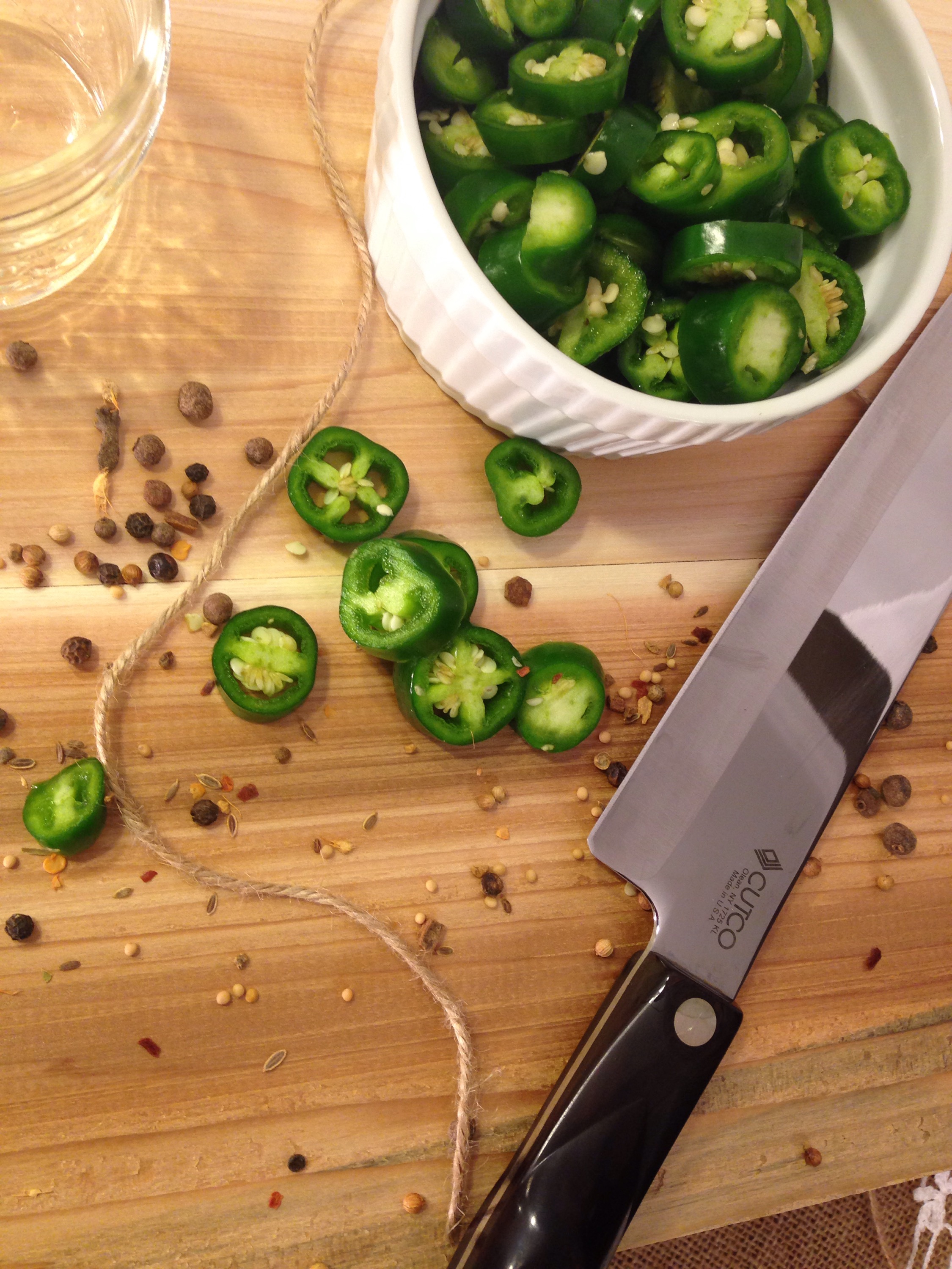 Wash jalapenos thoroughly, anything you are canning should be washed well to prevent contamination. Then slice jalapenos and set aside. In a sauce pan combine water, vinegar, and salt while bringing to a boil, stirring until salt is dissolved. Remove from heat. Pack sanitized jars with sliced jalapenos. Press the jalapenos down into the jar firmly. I try to pack as many little peppers as I can in the jars. Sprinkle roughly 1/4 of the pickling salt into the jars and pour the brine mixture into the jar leaving 1/4″ head space.