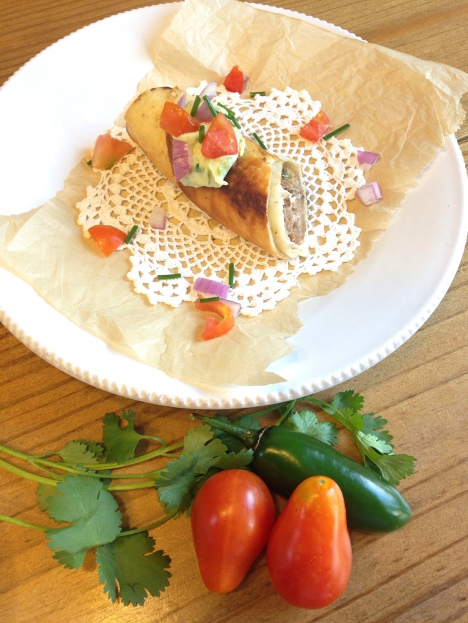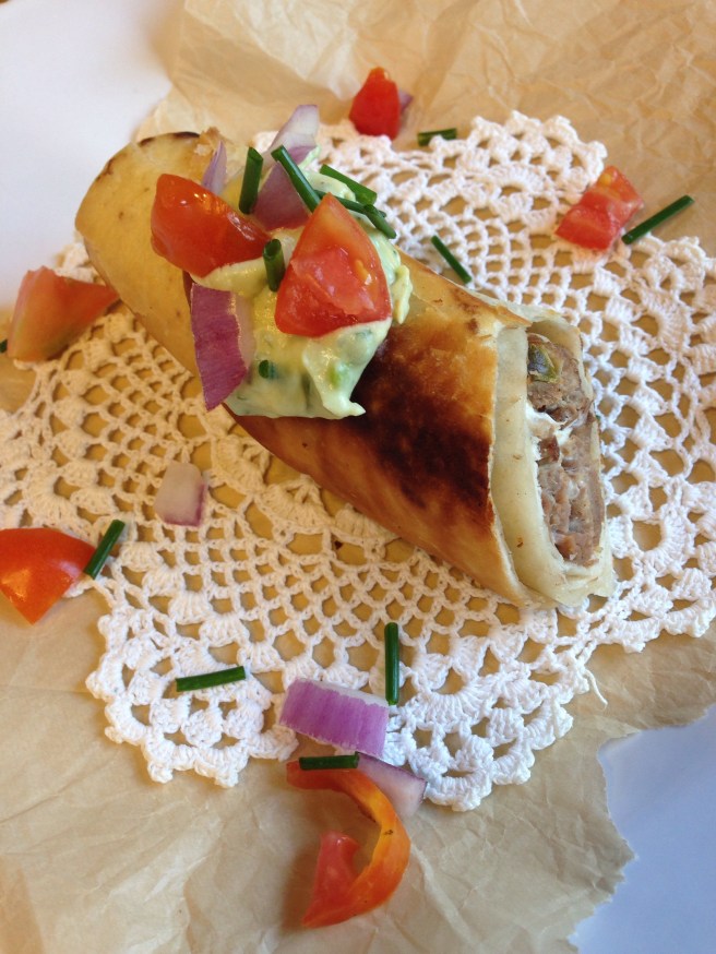 3.Start by chopping tomatoes, chives, and red onion and set aside. Then take a tortilla and spread meat mixture in a horizontal line about an inch thick and an inch tall, roll your tortilla and fasten with a toothpick and continue until meat mixture is gone. Then set aside.