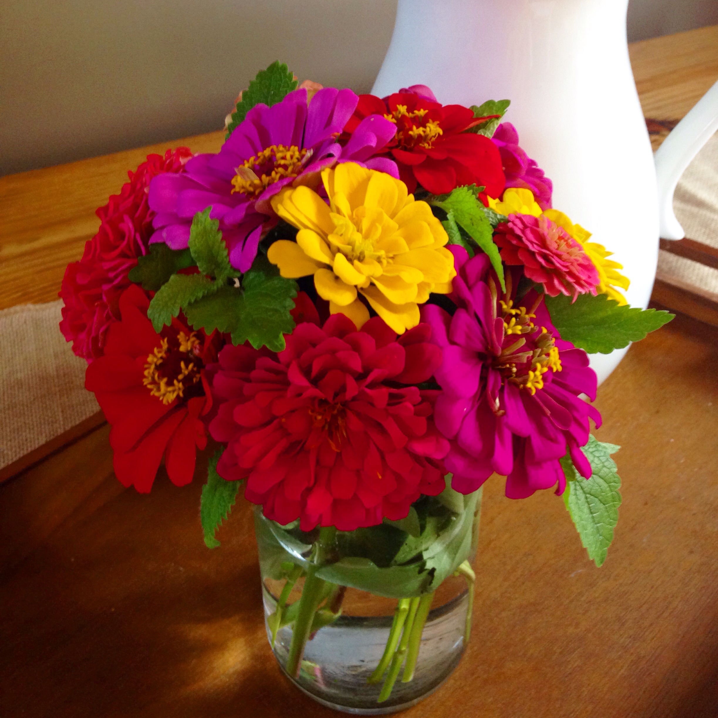 Zinnias make wonderful fresh-cut flowers to display in your home or as a gift. My fresh-cut Zinnias last about a week in a vase with fresh cool water, a tbsp of white vinegar and tbsp of granulated sugar. Be sure to change your water everyday to achieve the longest life span. I enjoy using my Zinnias for floral arrangements. Look how pretty!