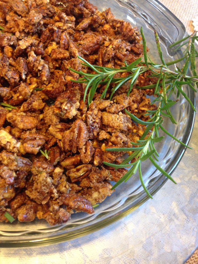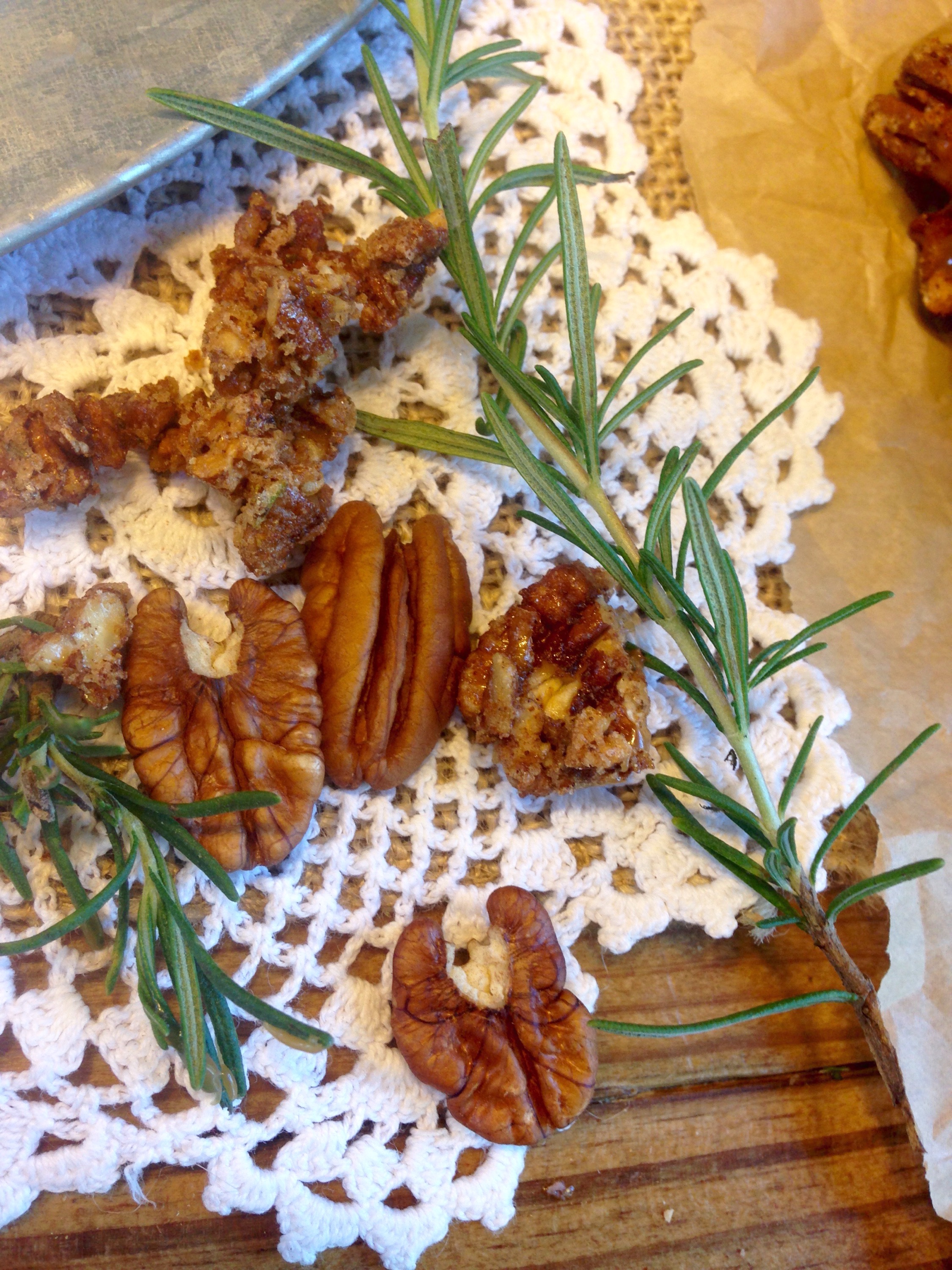 Roughly chop pecans and rosemary. In a bowl whisk sugar, rum, rosemary, vanilla, pumpkin pie spice, cinnamon and egg white until frothy. Put chopped pecans in mixture and coat thoroughly.