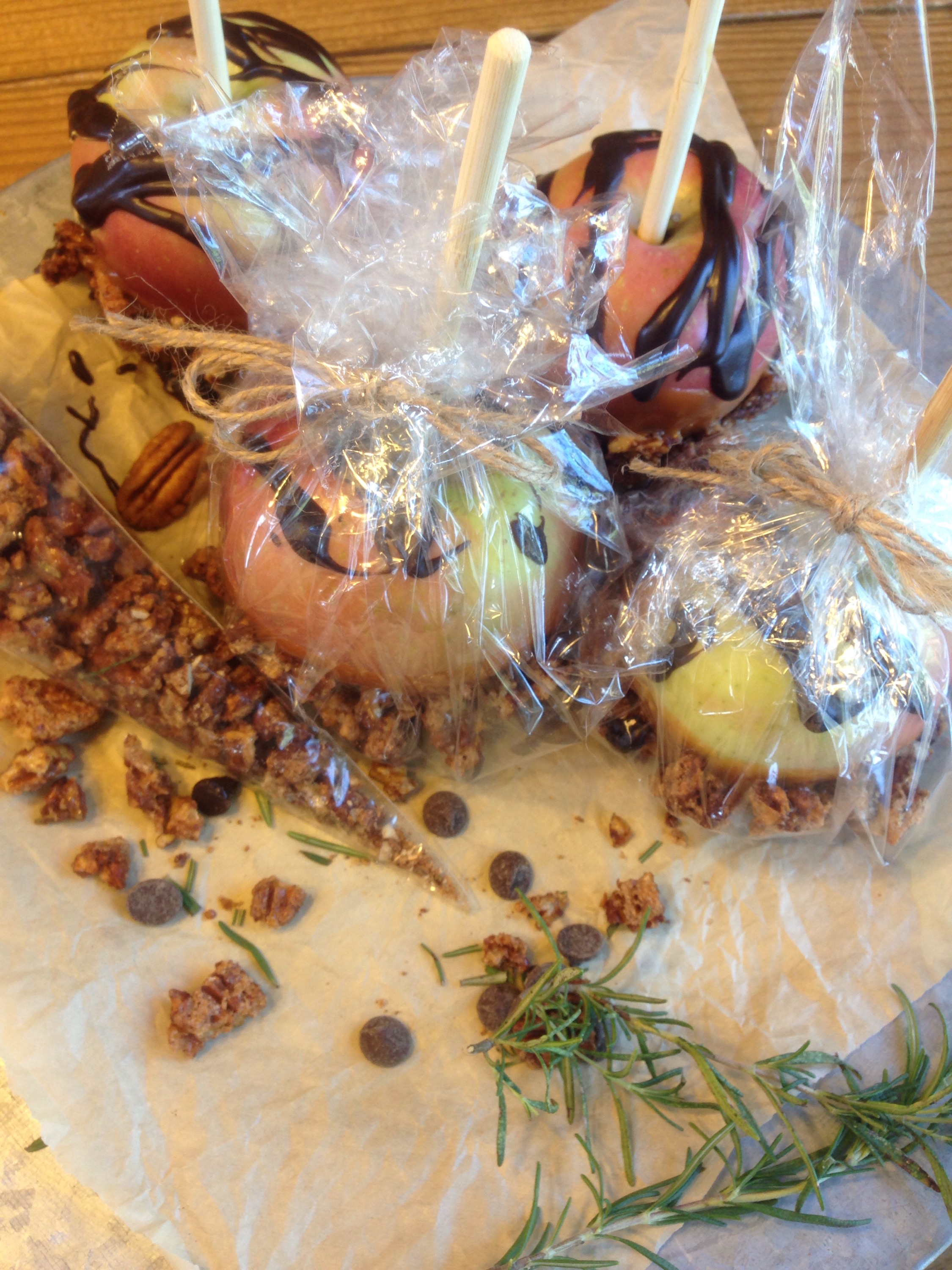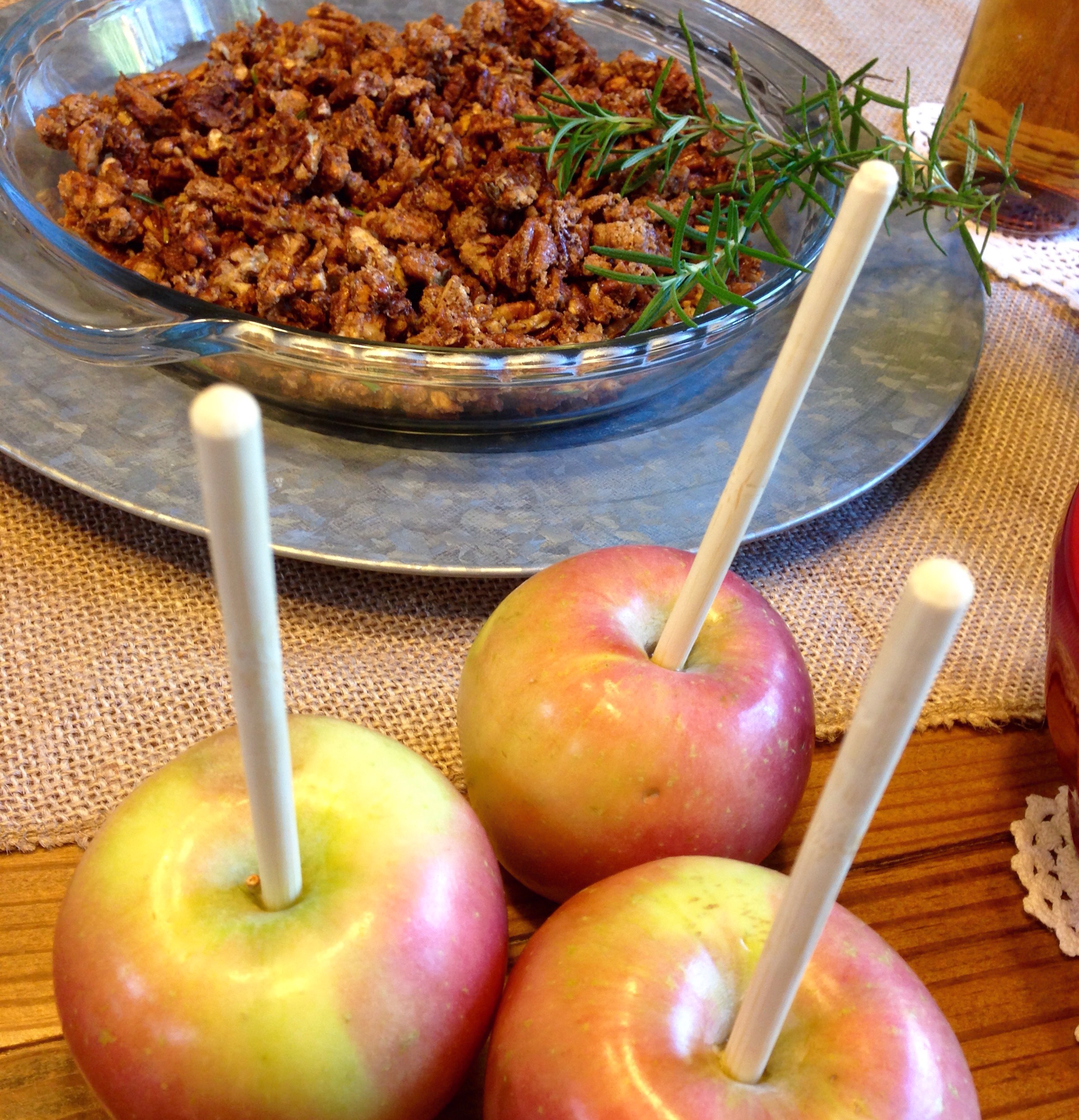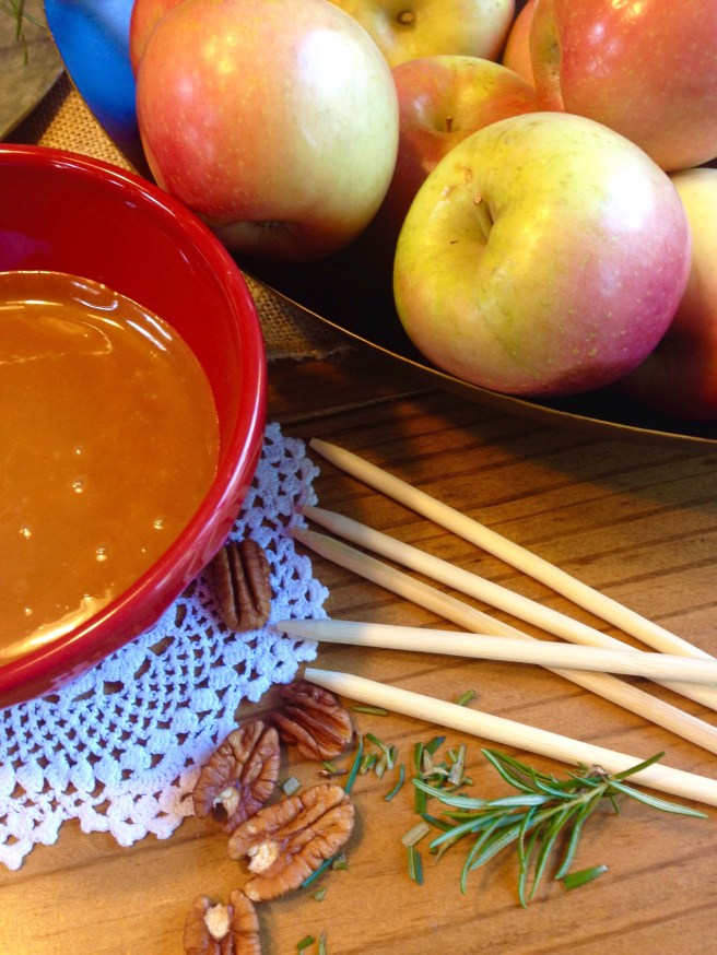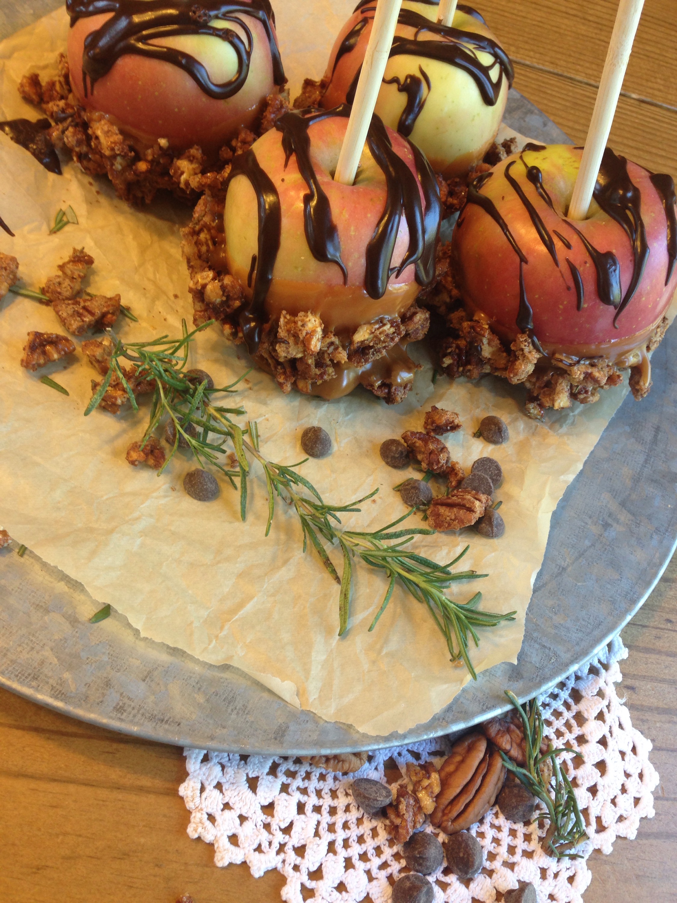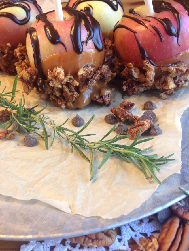 These caramel apples paired with rosemary pumpkin pie spiced pecans and a spiced rum chocolate drizzle on top are the perfect fall sweet treat! The pecans are loaded with flavor. The rosemary is a nice earthy addition to the pumpkin pie spice and cinnamon sugared nuts. Oh, there is spiced rum in the nuts too! I got a little carried away! Plus, rosemary is my favorite herb from my garden. I have three rosemary plants to make sure I have plenty of the delectable herb on hand to add to my recipes!