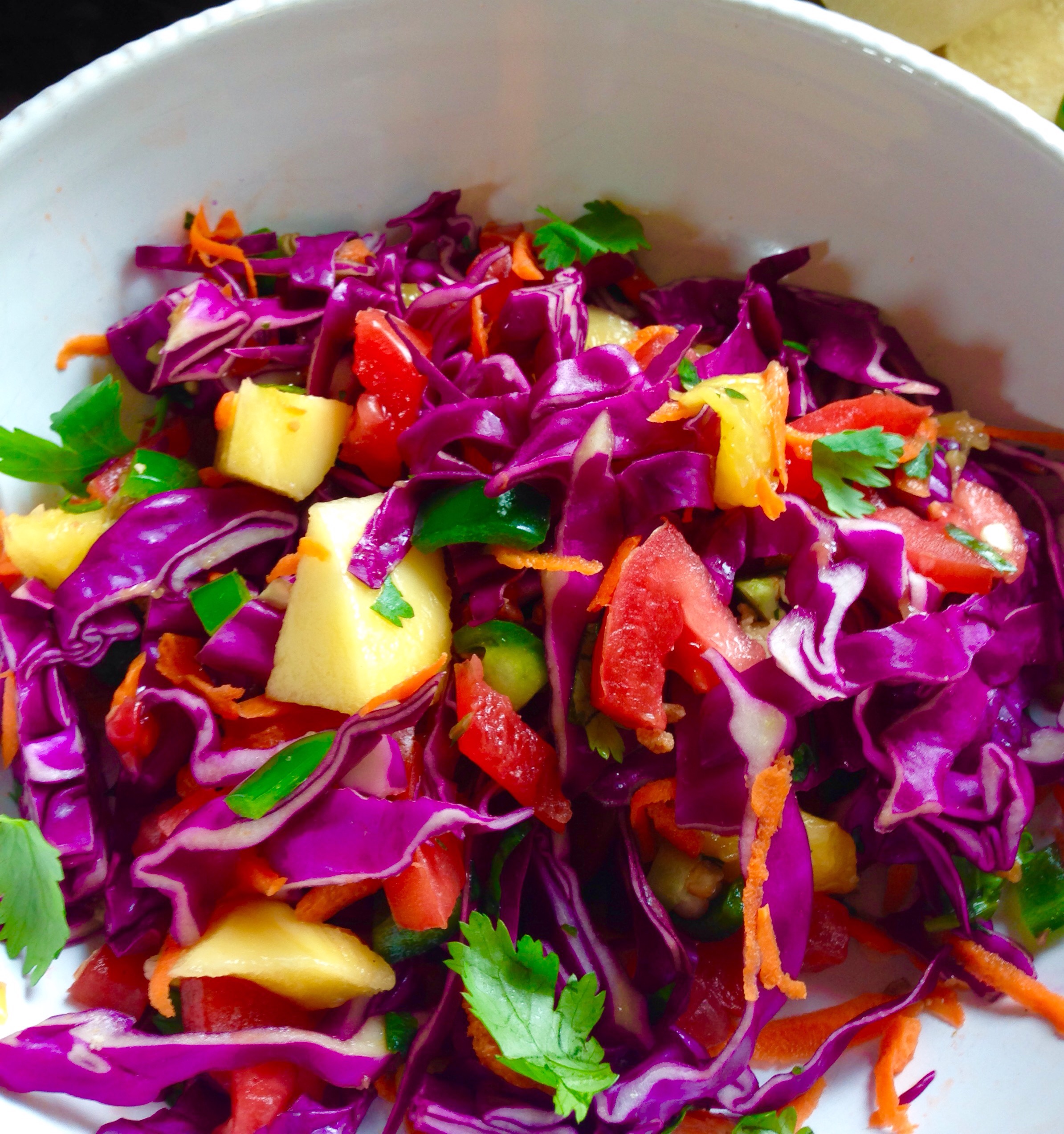 Start by chopping cabbage, tomatoes, jalapenos, mangos and place in a bowl. Then skin carrot and grad with cheese grader and add to bowl. Take a handful of cilantro and roughly chop, add to the bowl as well. Juice half of lime over slaw, add salt and peppers to taste and stir a few times. Then set a side.