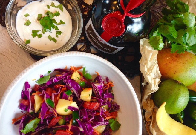 Chop basil into small pieces then in a small bowl mix yogurt, coconut milk, grand marnier and basil. Mix until smooth and set a side. If you don’t want the booze in it you can substitue with orange juice. It will do the job!
