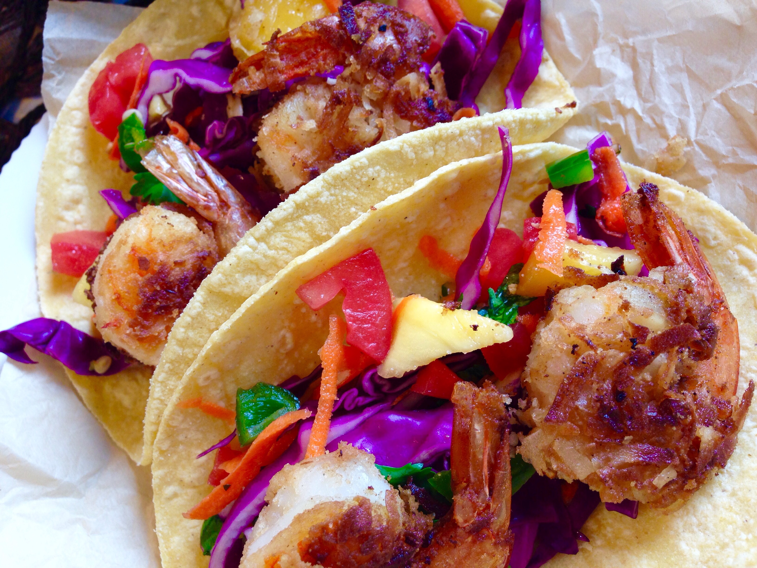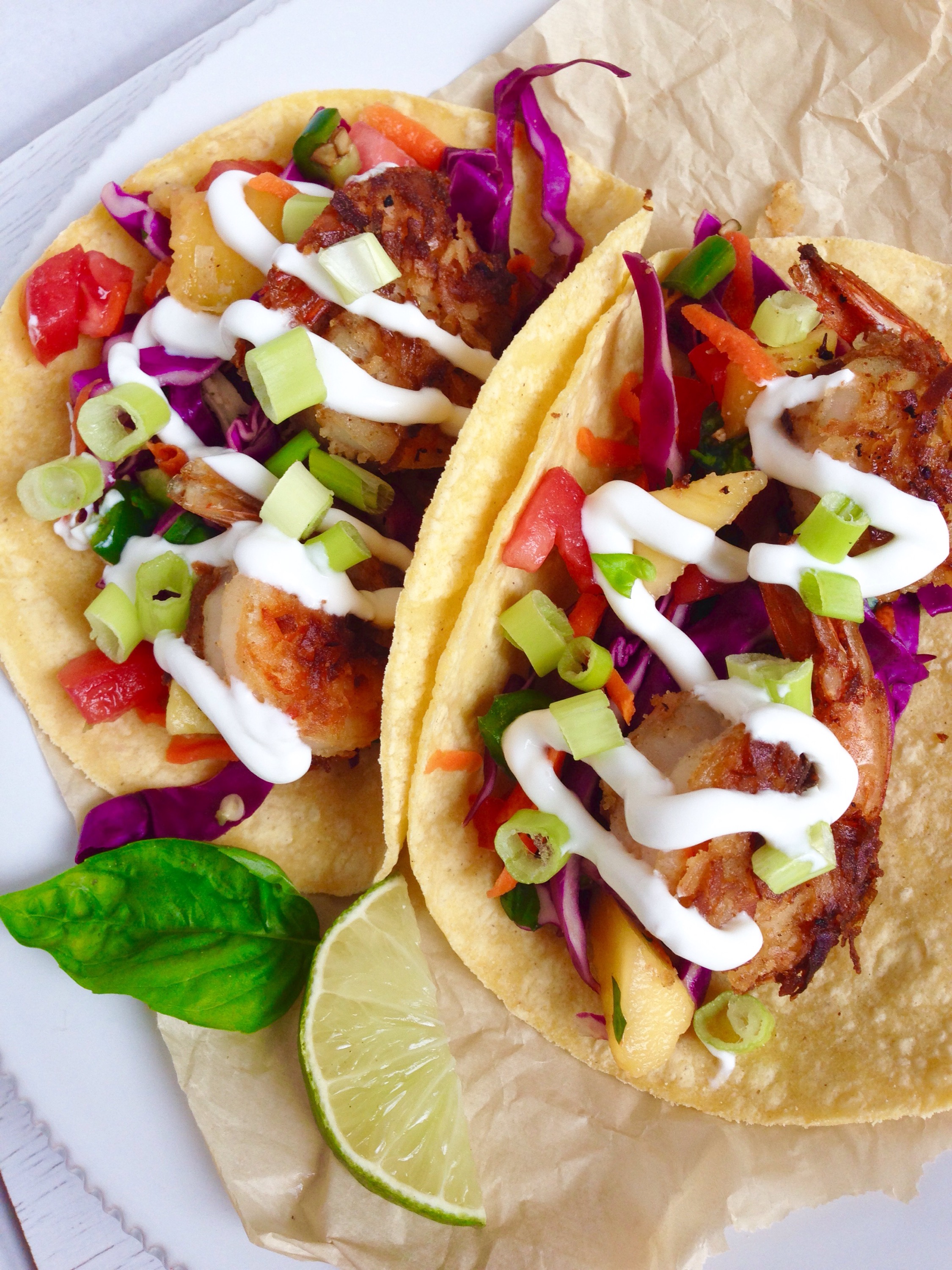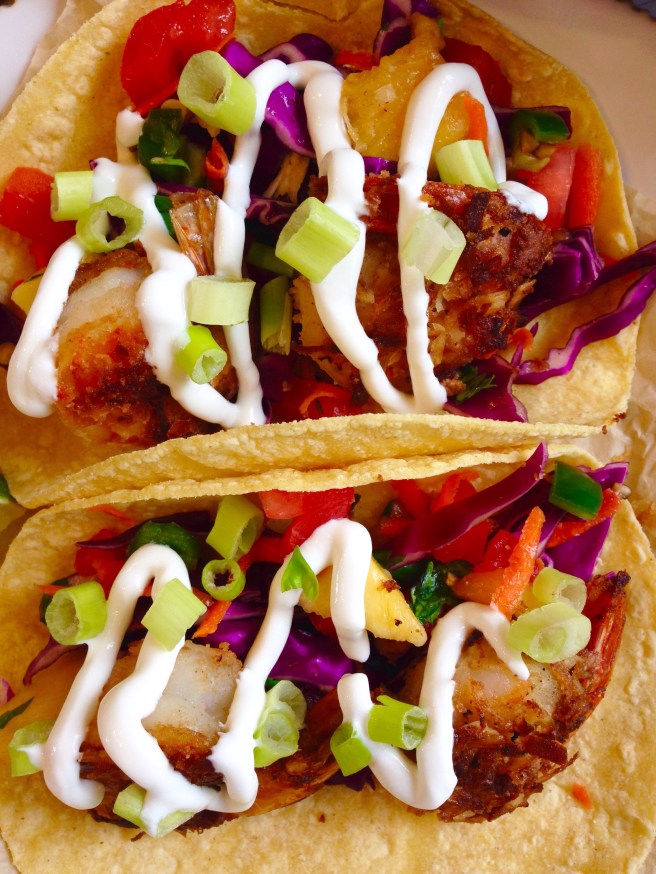 Place shrimp on a plate with a paper towel to help soak up some of the oil. Then assemble your tacos. Place corn tortilla onto plate, add slaw, 2-3 shrimp and top with cream sauce. Garnish with chopped scallions and serve with a slice of lime! This recipe yields about 8 to 10 tacos.