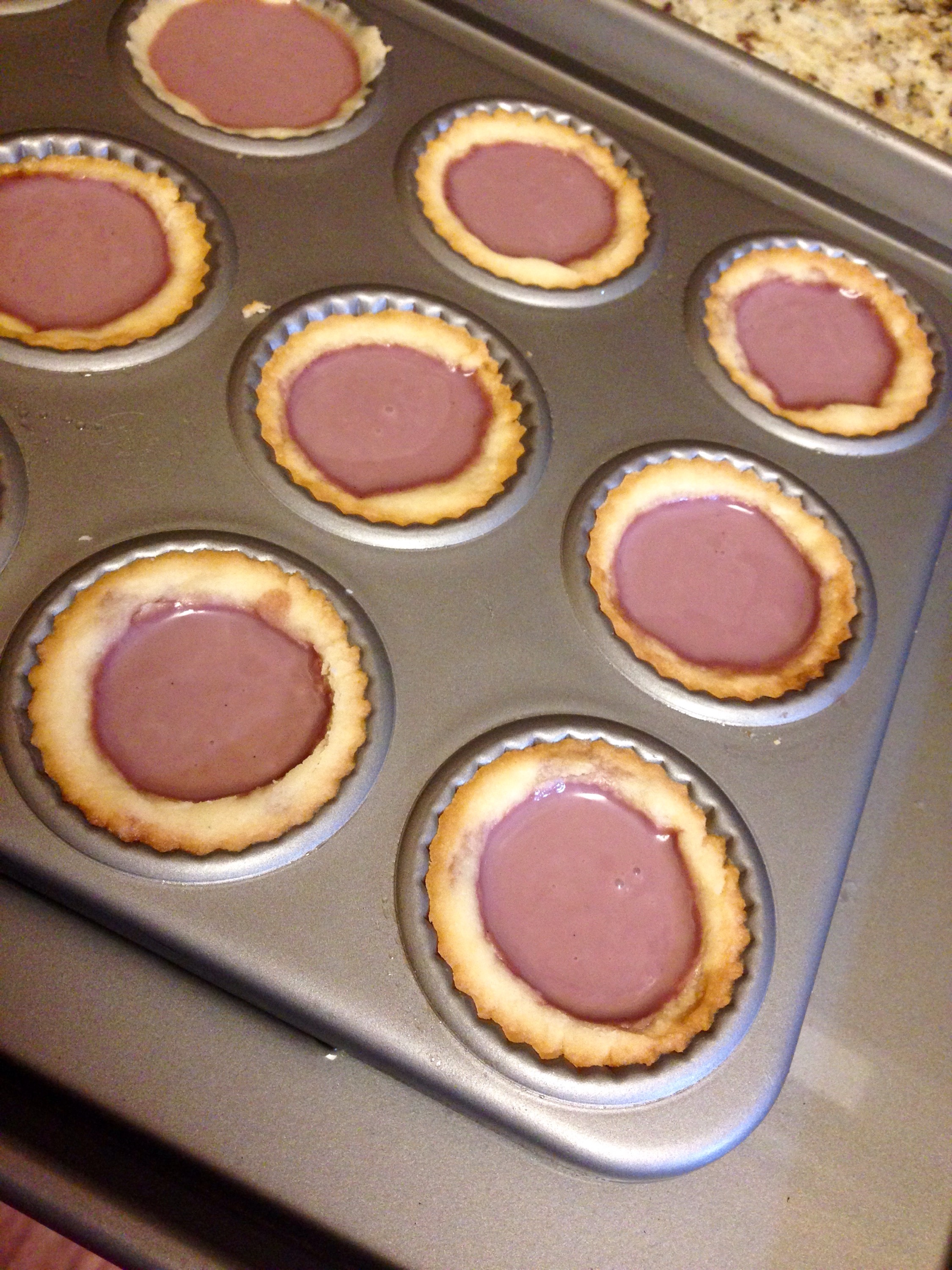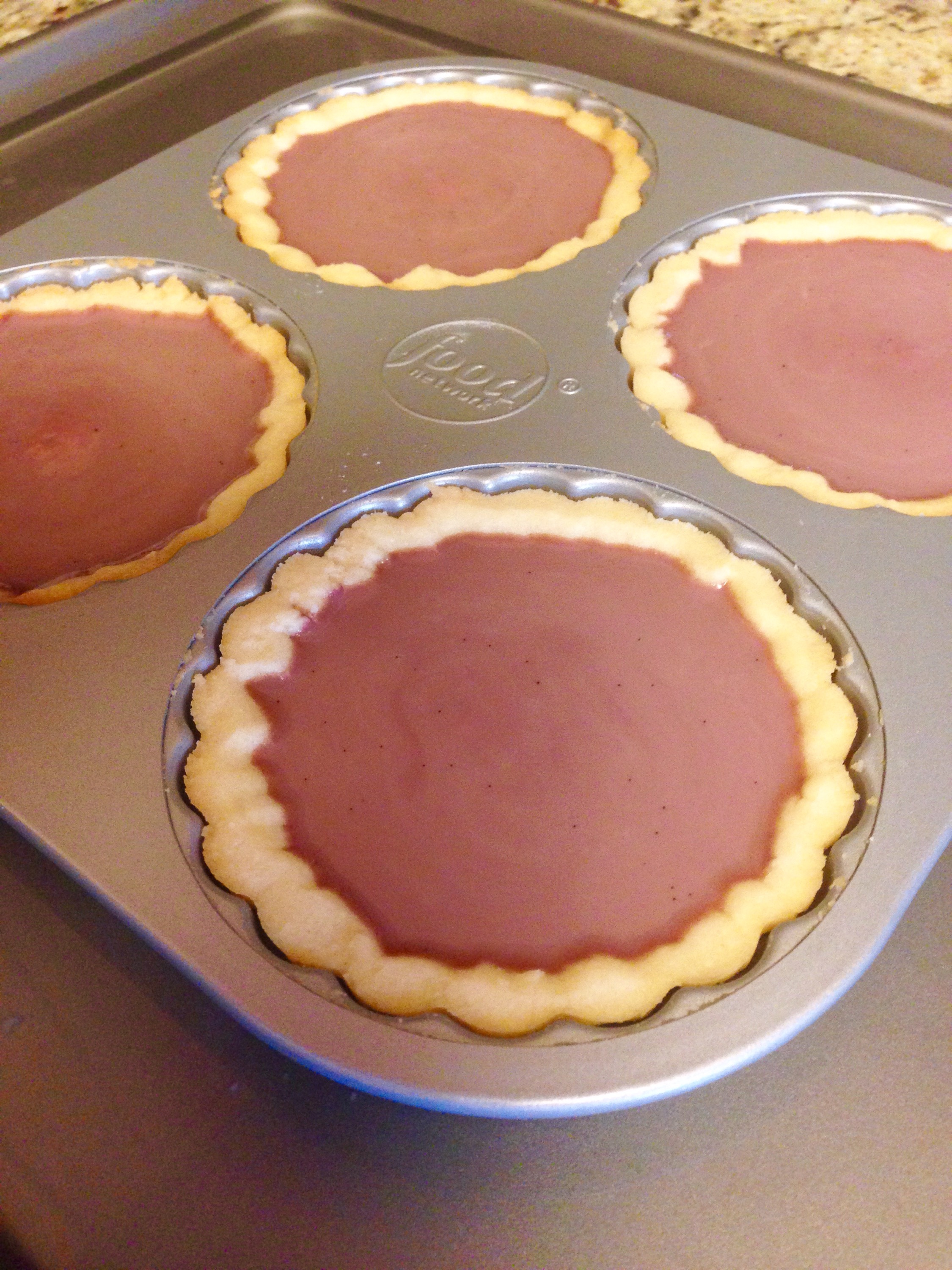 Slowly pour the rest of the hot cream into the bowl. Add food coloring if desired. I added about 4 drops of each to enhance the purple of the custard. Then ladle the hot cream into your tarlet crusts. Pour the hot water from the sauce pan onto baking sheet and place your tartlet pan in the water. This water bath prevents the custards outside from overcooking before the center is cooked.