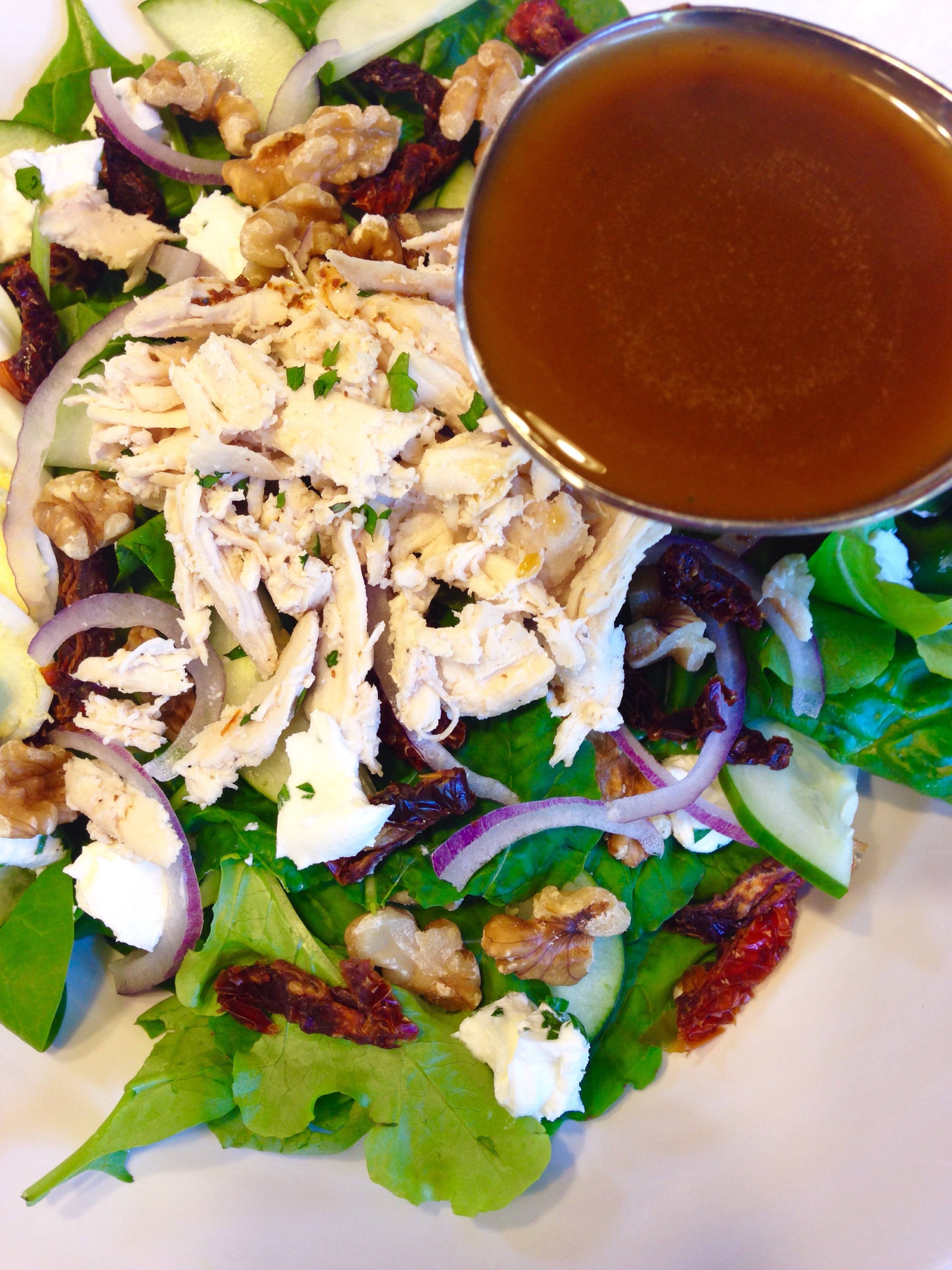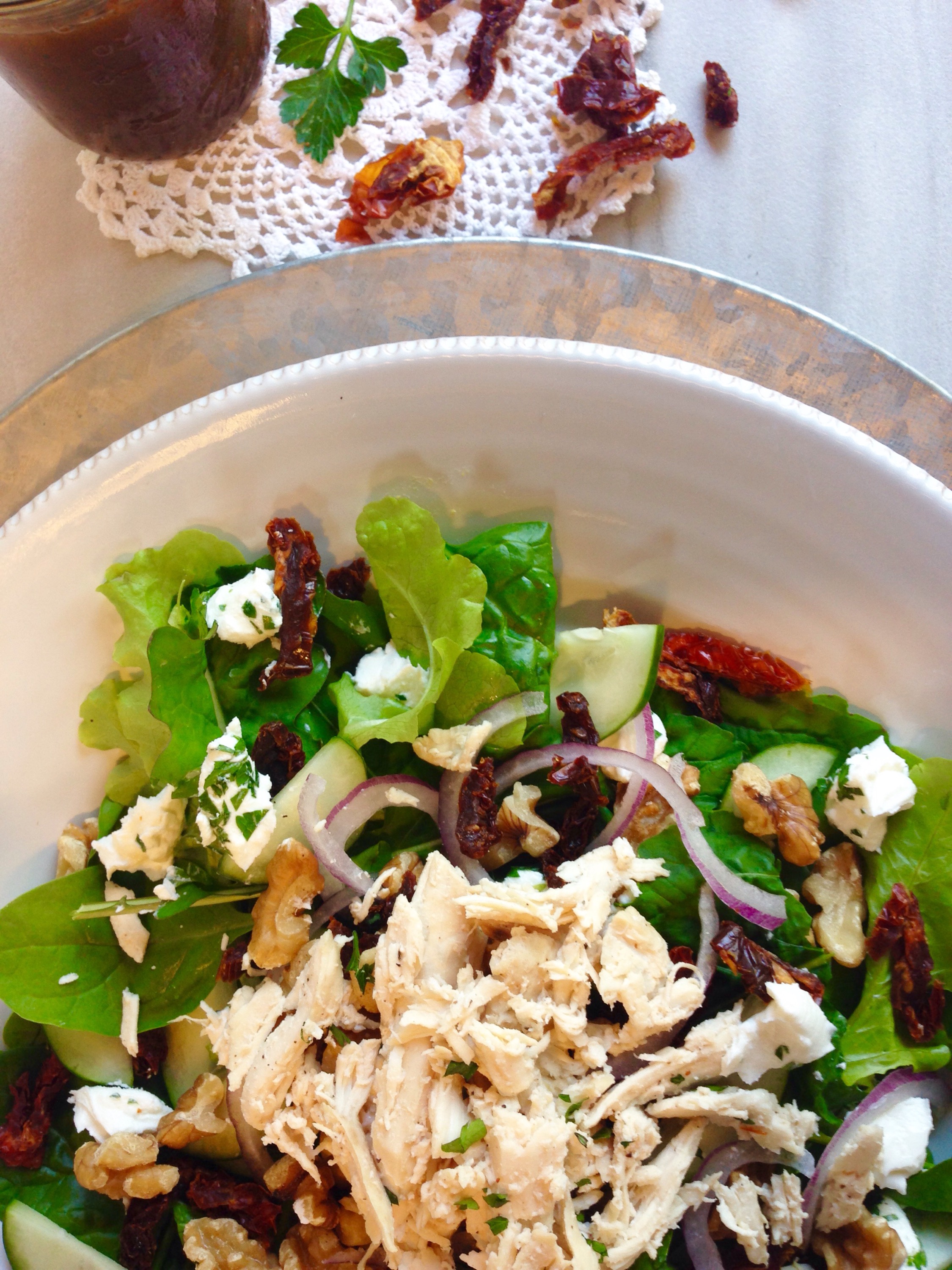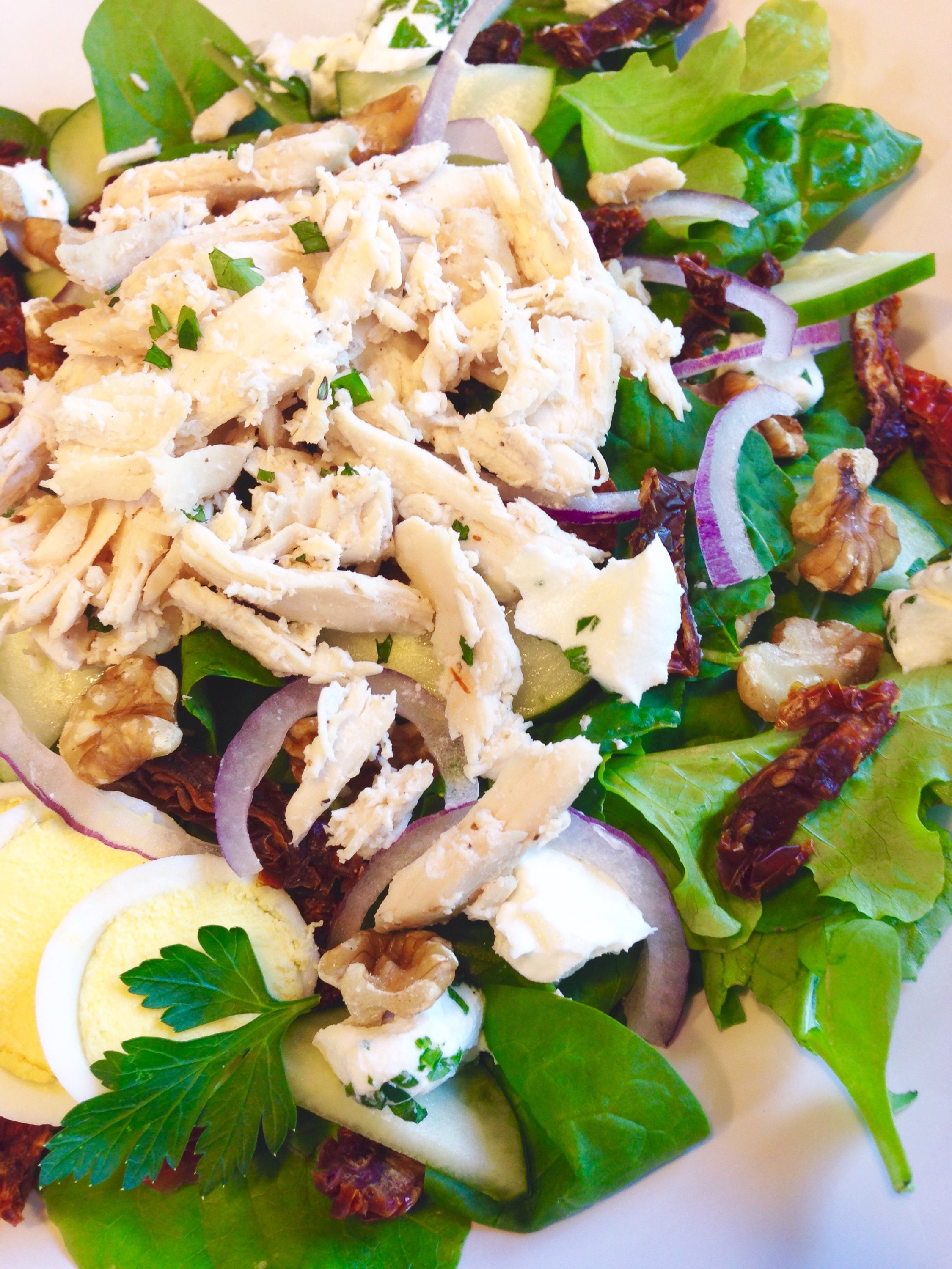 Once chicken is cooked remove from oven. I shredded my chicken in my kitchen aid mixer but you can also do it with a fork and set a side. Then wash and roughly chop lettuce, arugula and spinach and place in a bowl. Chop parsley then take the log of goat cheese and roll in freshly chopped parsley. Crumbled 1/2 of the log of goat cheese with your fingers over the bowl of greens. Store the remaining cheese in fridge. Chop onions, cucumbers, and eggs. Add walnuts, onion, sun-dried tomatoes, boiled eggs, cucumber and chicken to bowl. Shake mason jar well and top your salad with dressing. Place into serving bowls and top with more fresh parsley. This recipe yields about two servings.