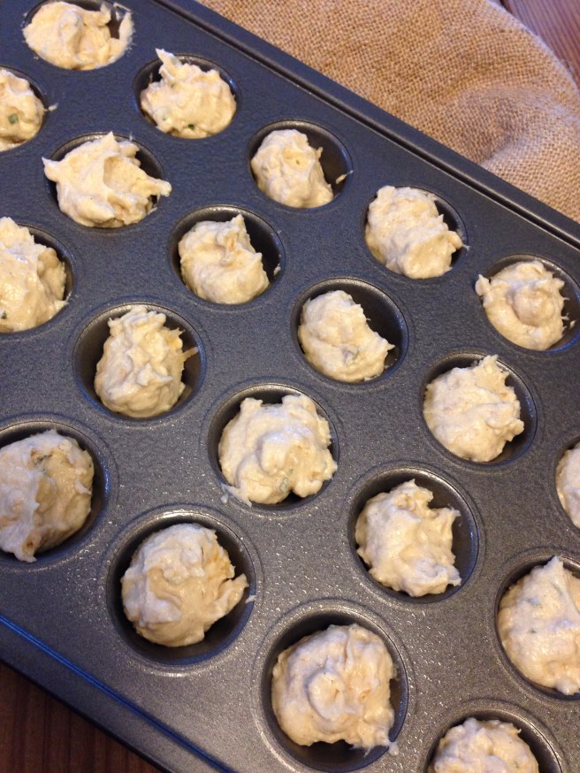 Preheat oven to 375 degrees. Spray mini muffin tin with a non stick spray and fill each muffin tin 2/3 of the way full and bake for 10-15 minutes or until they are golden brown.