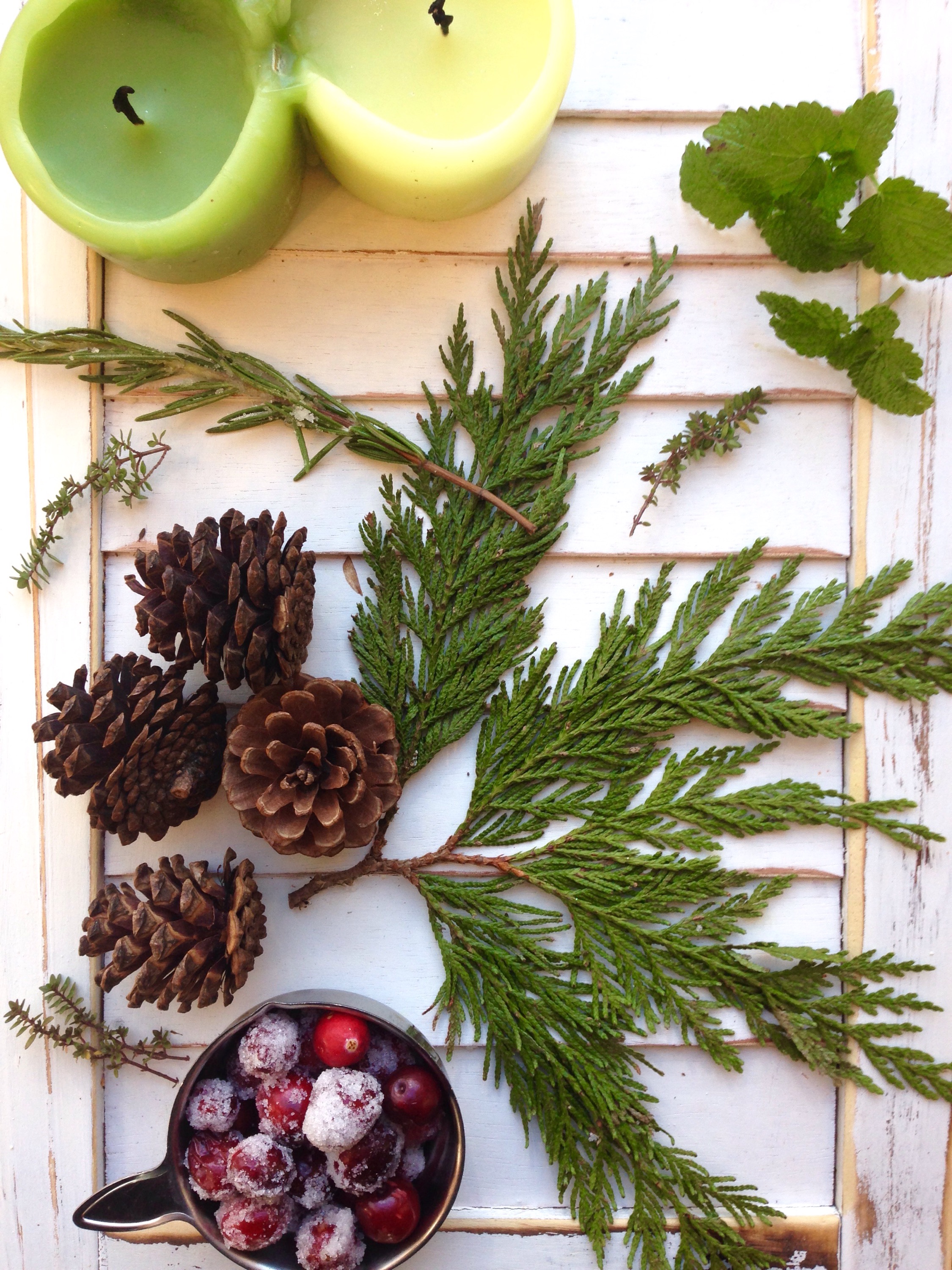 6. Place your pinecones randomly around the candles. Then add your thyme or any other herbs you chose to inquire in your piece.