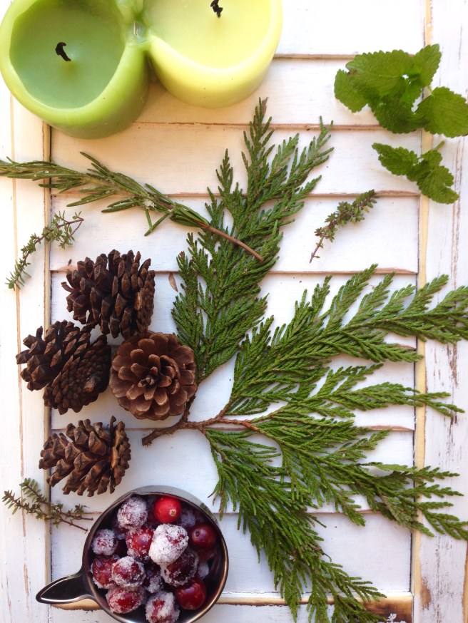 5. Then tuck your candied rosemary under the cedar spring . Don’t worry if some of the sugar falls off it will just add to the centerpiece and look like more snow! So cute!