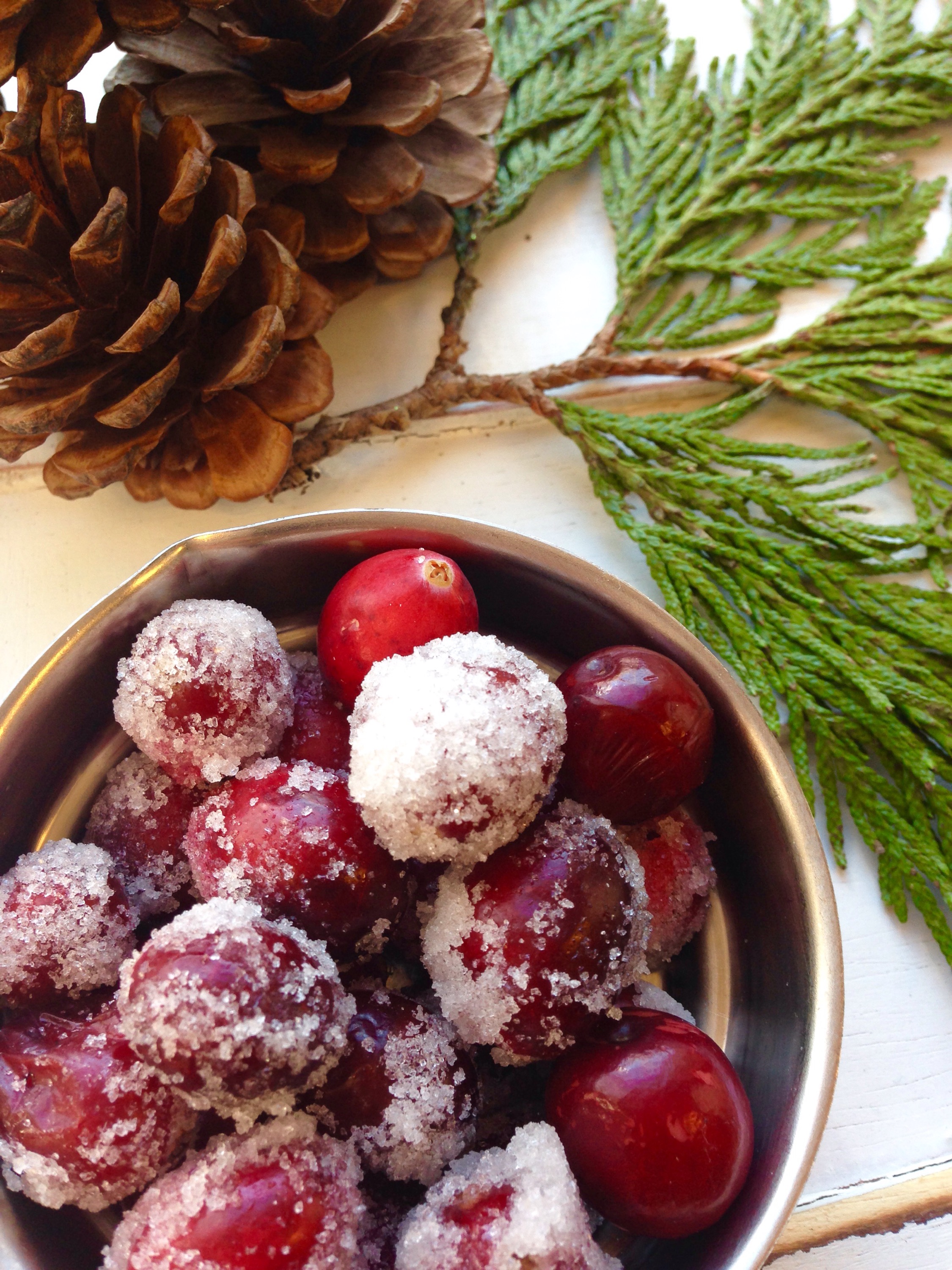 I was making a cake for my holiday party that included these beautiful candied cranberries! Which I just absolutely LOVED because they look like they are covered in snow! This is how I got the idea to use them in my centerpiece. Then I thought why not candy the rosemary too! I feel like the candied cranberries and rosemary are such a festive addition to this piece! Nothing says holidays like a little snow fall right!?