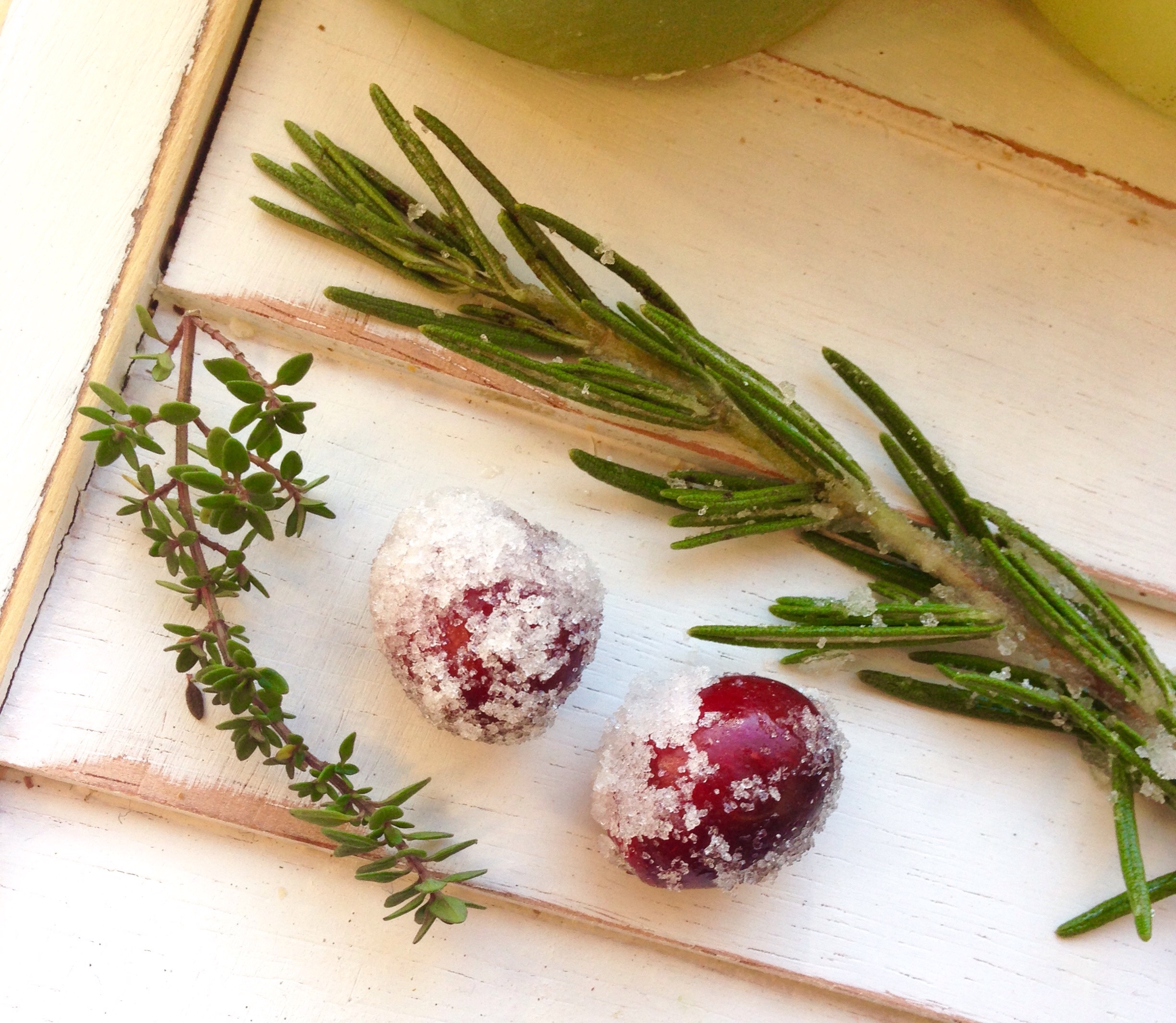 3.Quickly dip the rosemary in the simple syrup and then roll in the sugar, coating the rosemary well. Place the rosemary with the cranberries to also dry for one hour.