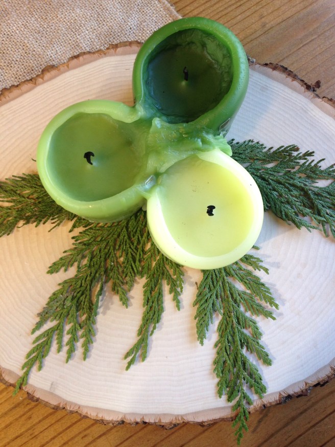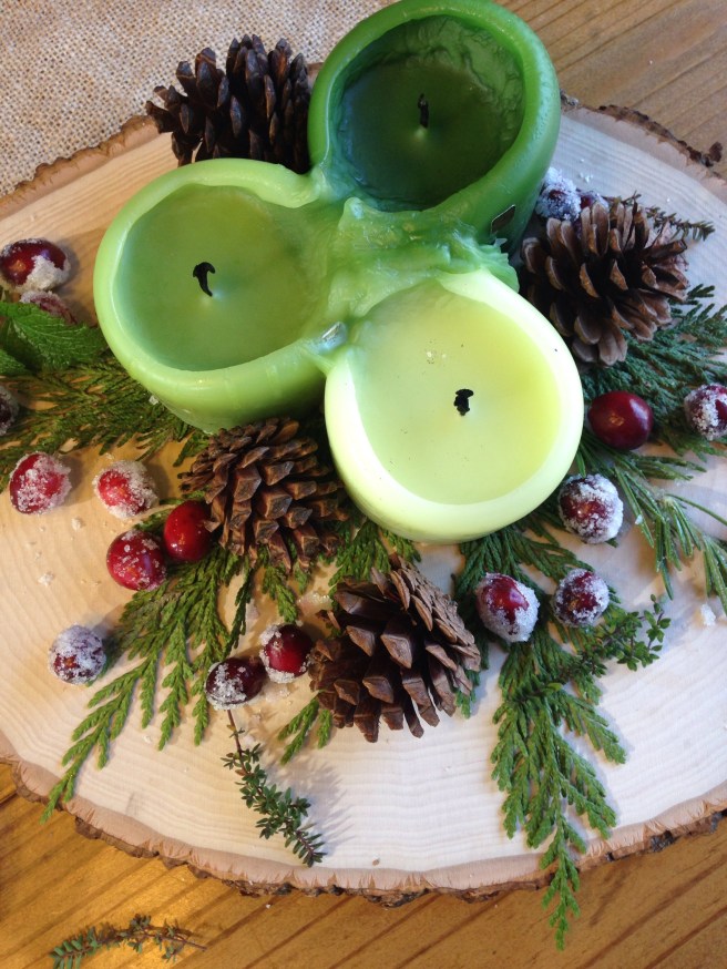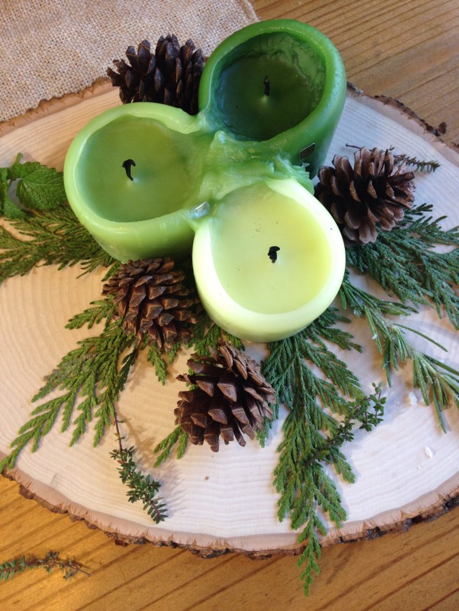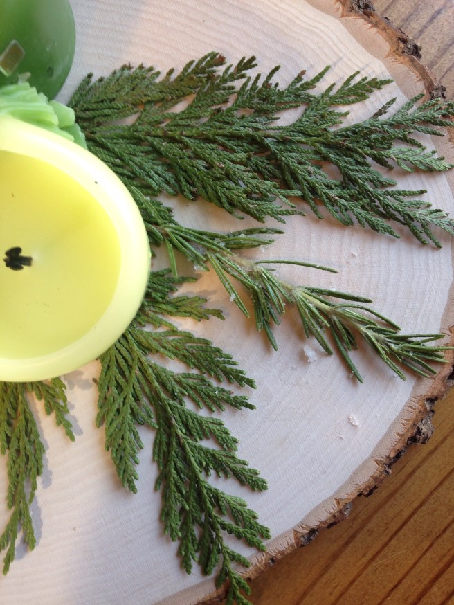 4. Place your spring of cedar pine flat on your wood slice serving tray. Then place your candles over the stem of your cedar spring.