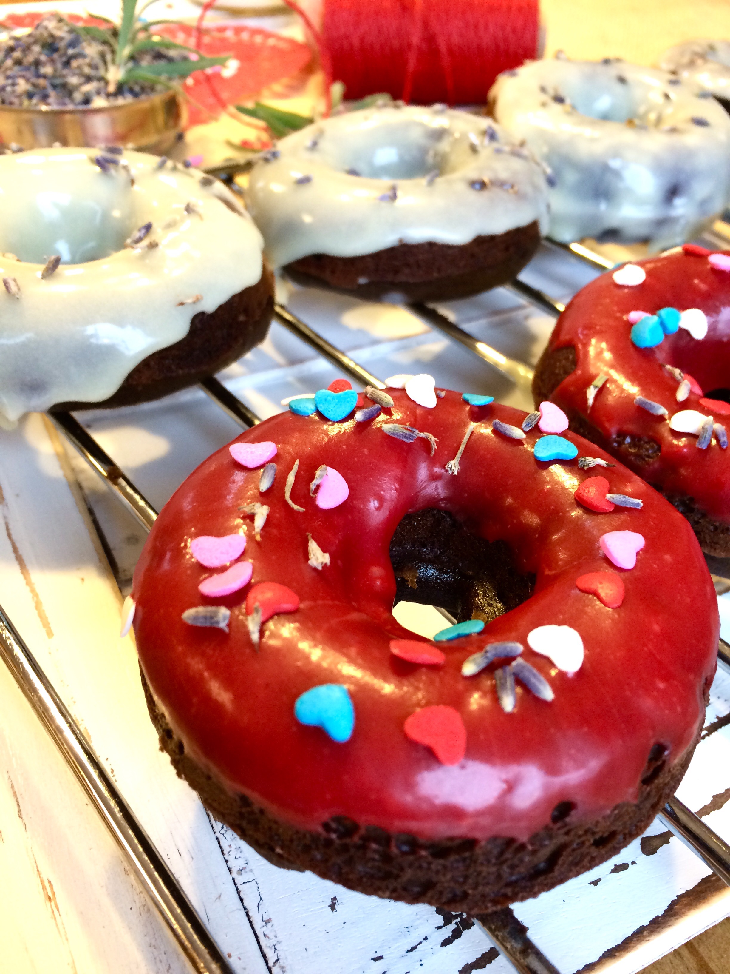I made these donuts two ways, one with heart sprinkles and the other with just sprinkled dry lavender. The red chocolate ganache was just made with red colored candies to be festive. If you want to make it with just white chocolate you can.