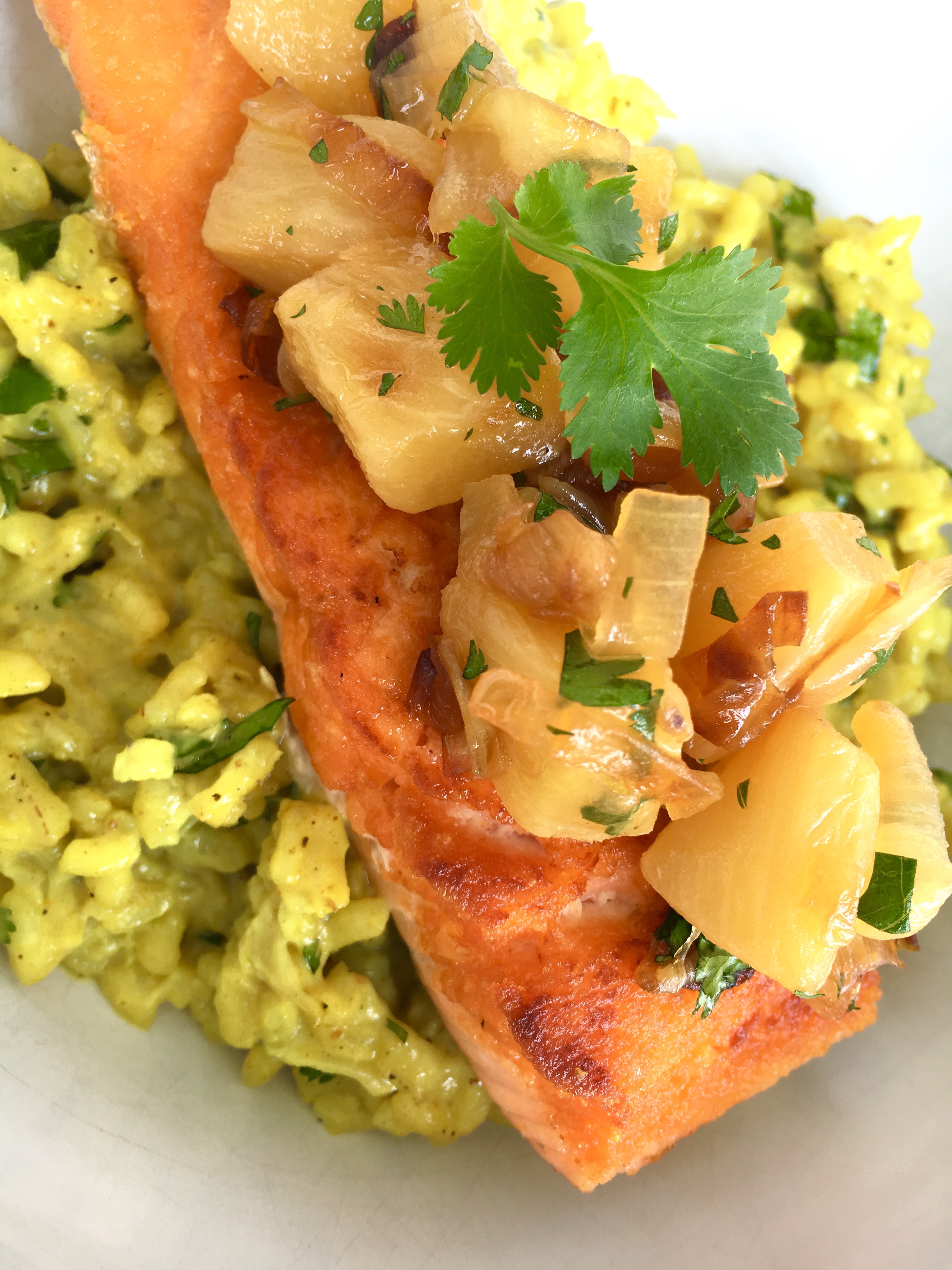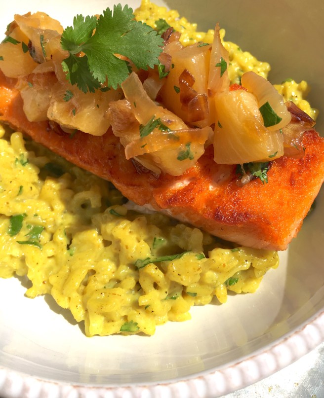 5. Place risotto in bowl, place salmon on bed risotto and salsa on top of the salmon. Garnish with more cilantro if desired.