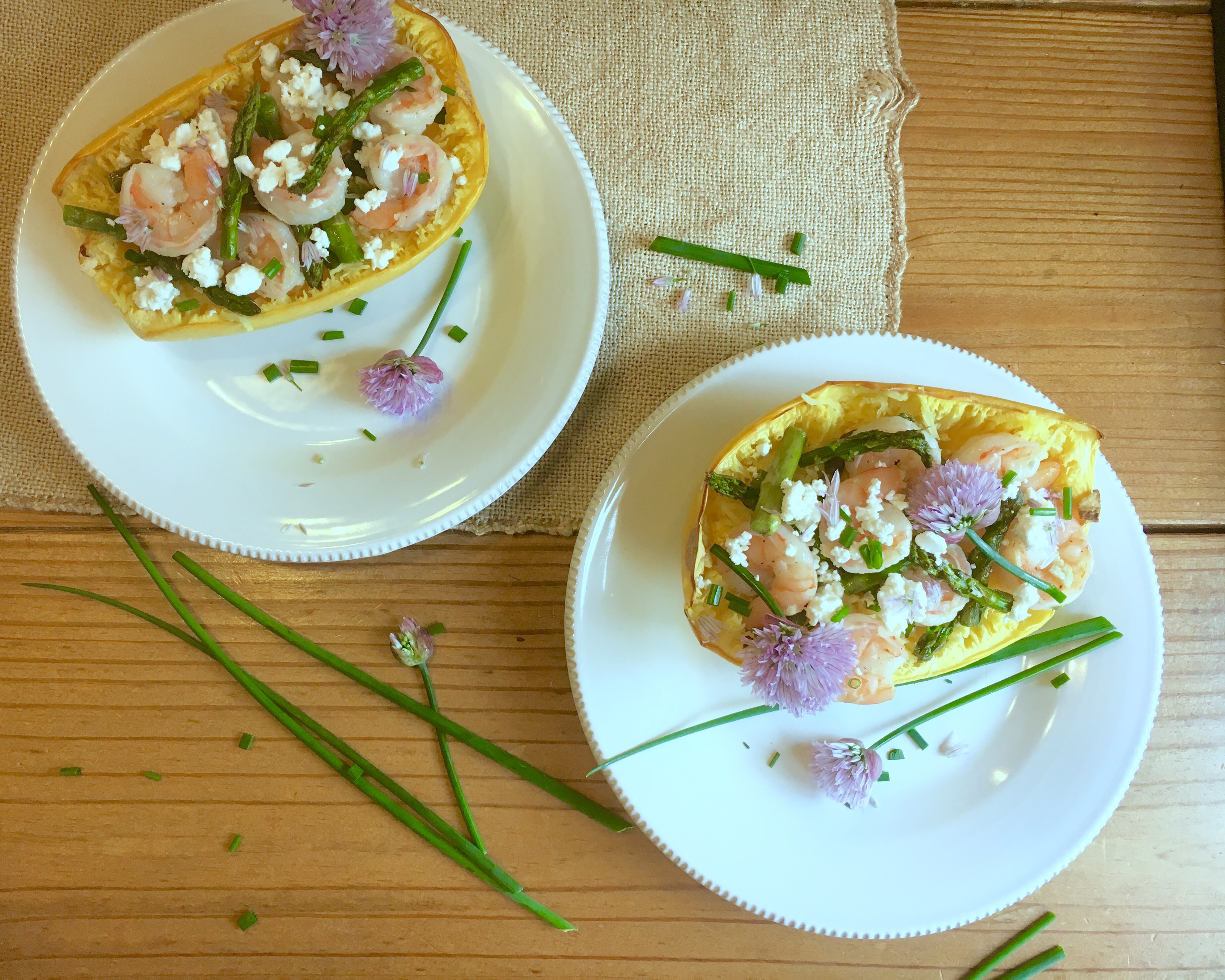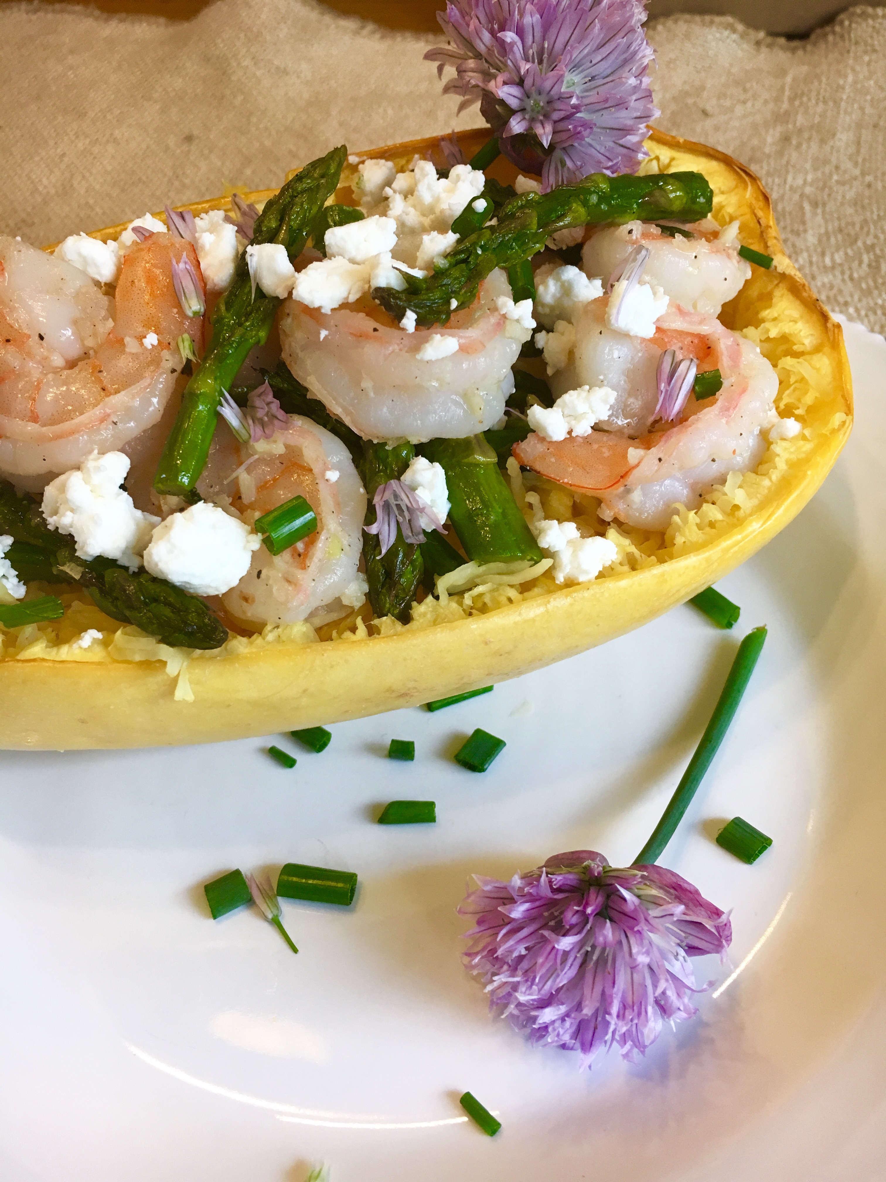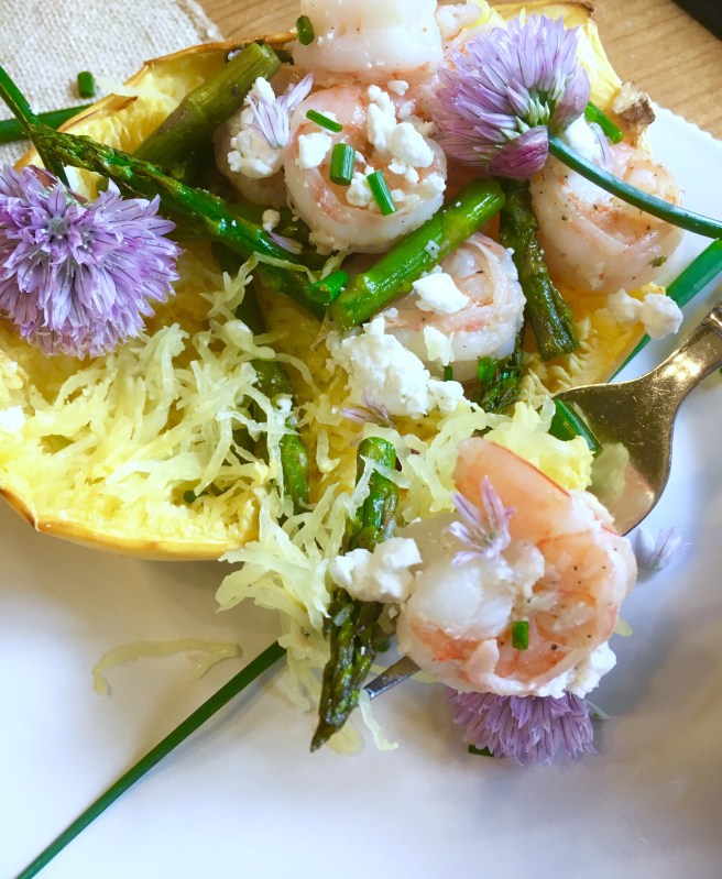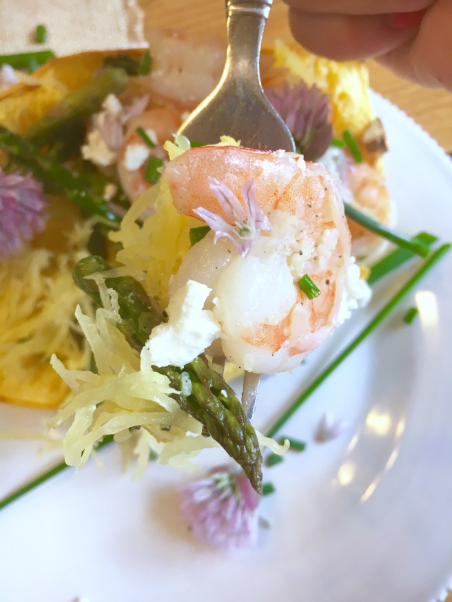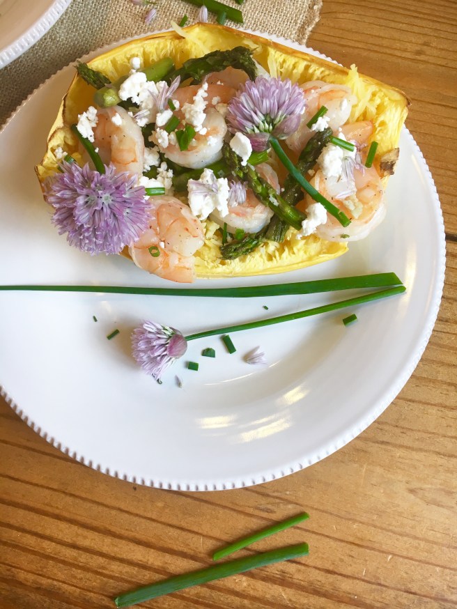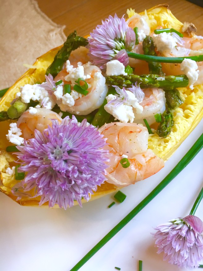 6. Top with shrimp and asparagus. Then sprinkle on your goat cheese crumbles, chives and chive blossoms.