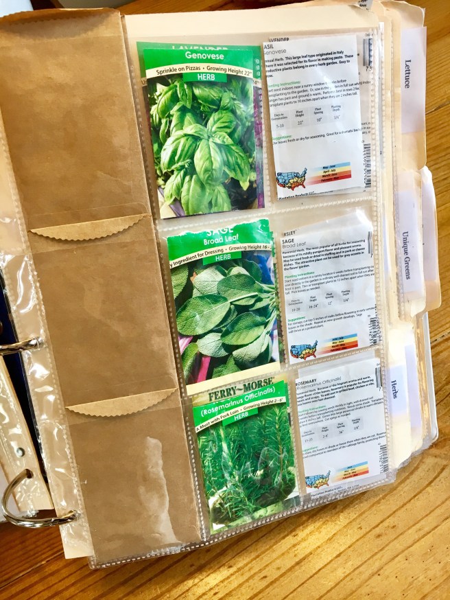A seed binder! Each seed packet is cut in half and placed into baseball card sleeves so you can clearly read the information on the seed packet. The seeds are placed into a separate envelope which is then placed next to the original seed packet.