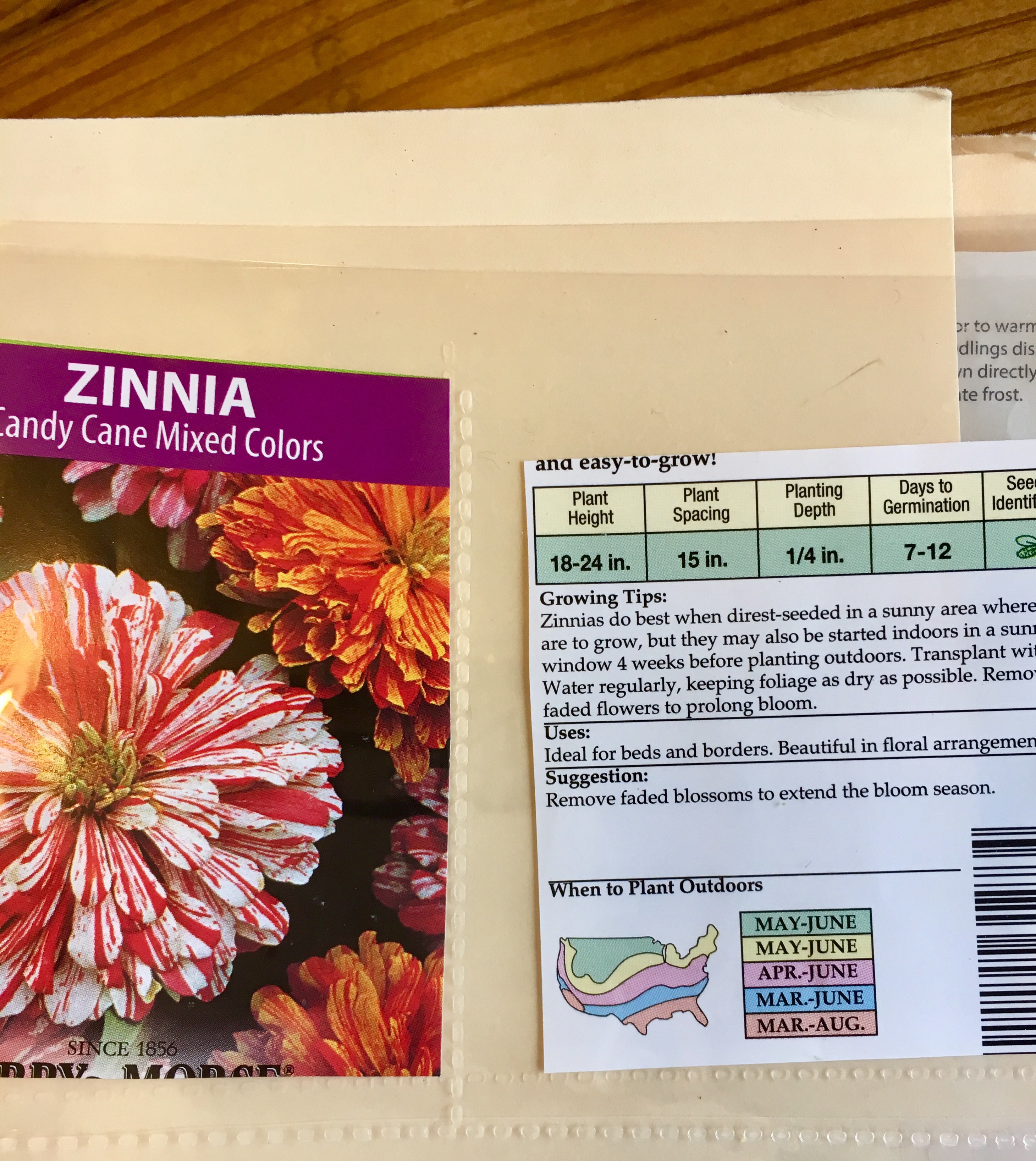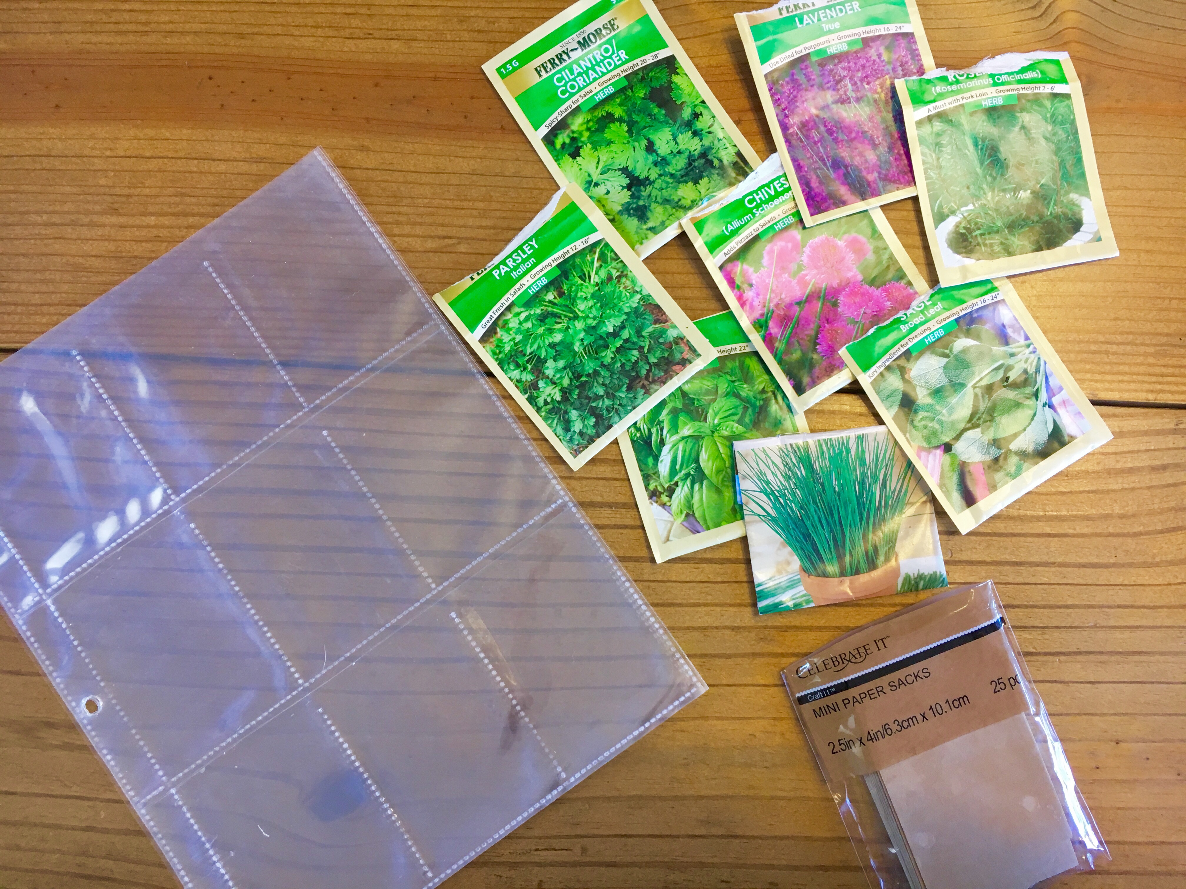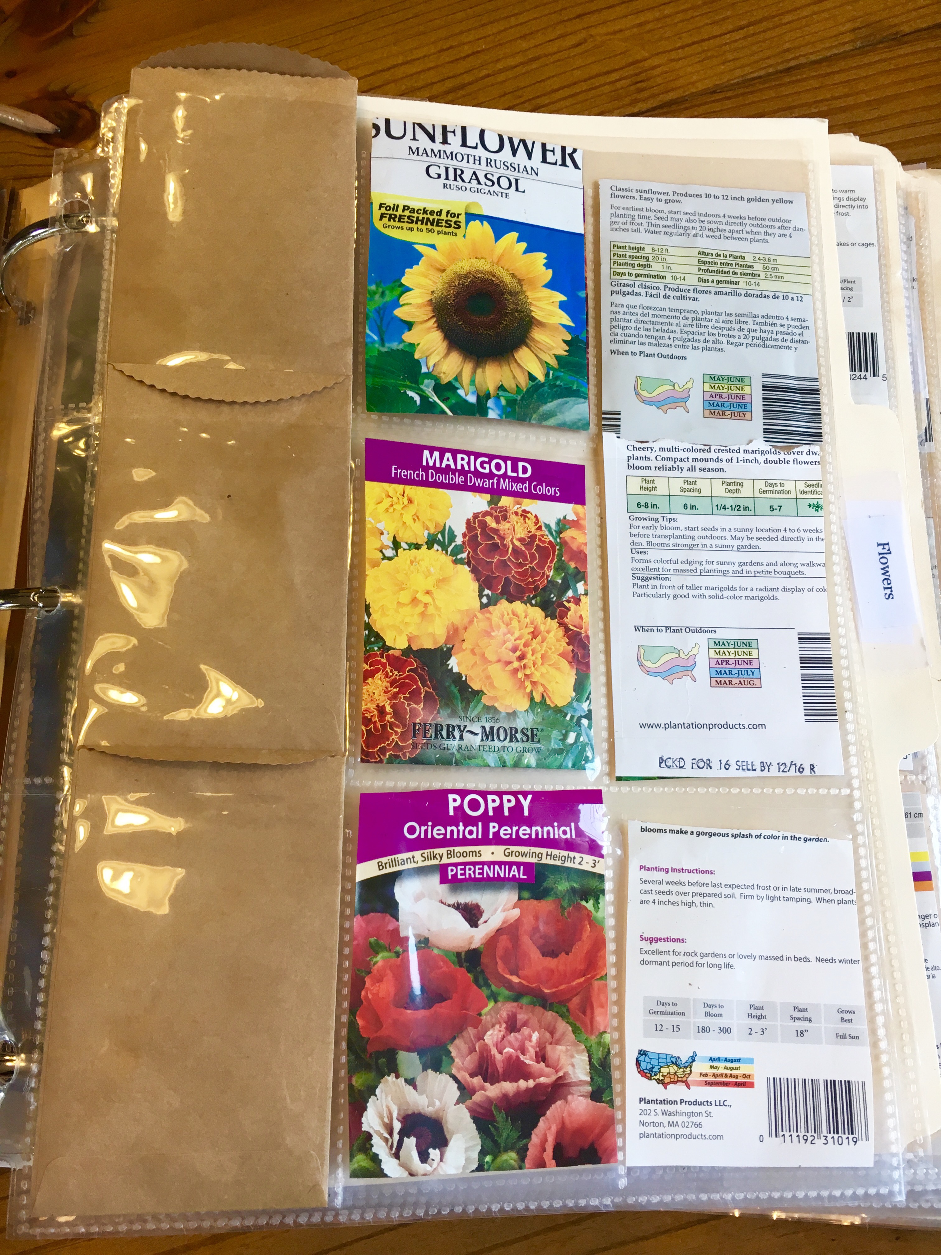 A seed binder! Each seed packet is cut in half and placed into baseball card sleeves so you can clearly read the information on the seed packet. The seeds are placed into a separate envelope which is then placed next to the original seed packet.