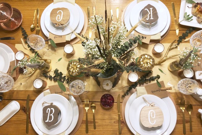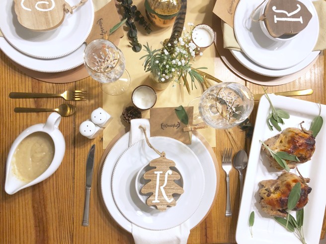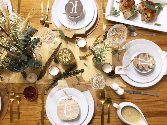 So I went to the target dollar spot to get inspiration for the theme for our table! They had adorable copper, gold and wood fall decor that I loved so I ran with it! The rose gold chargers under our plates, copper gold candles, wooden ornaments, festive clothes pins, wine toppers, little white pumpkins, craft paper (table runner) and the silver and copper flower vase were all items purchased in the target dollar spot! Below is a link to shop Targets dollar spot! They have adorable holiday decor!