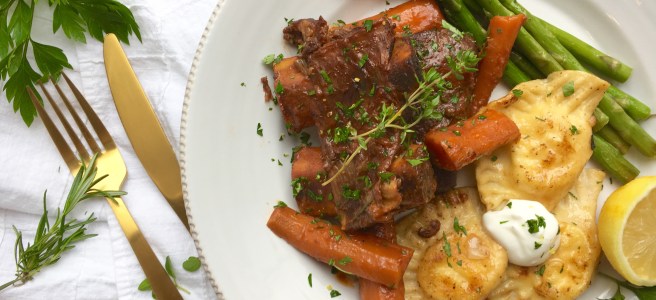 Red Wine & Herb Braised Short Ribs with Gremolata & Farmers Cheese Pierogies